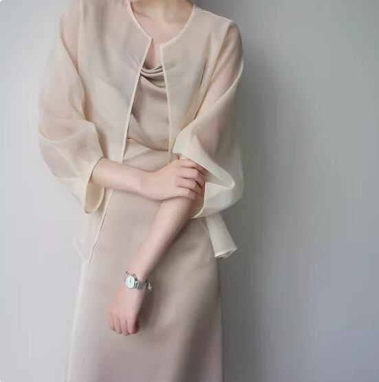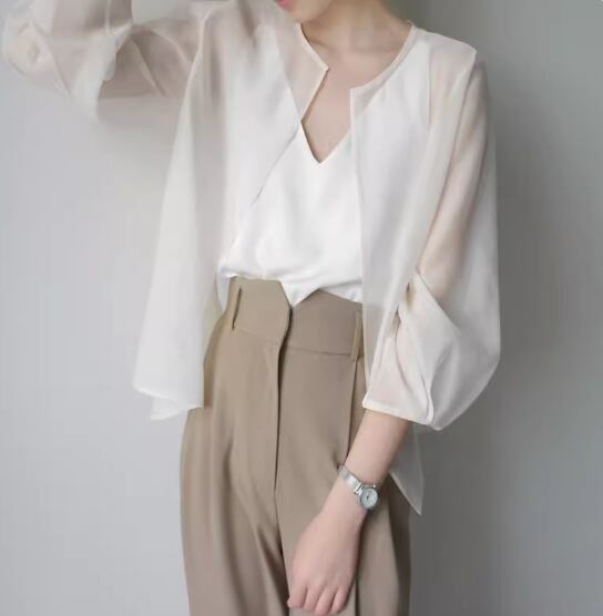 ボリューム袖シアーカーディガン 白トップス 袖あり 7分袖 七分袖 ボリューム袖 ワイド シフォン 前開き 透け感 シースルー 薄手 大人可愛い きれいめ シンプル カジュアル 上品 おしゃれ お洒落 エレガント フォーマル とろみ感 無地 春 夏 20代 30代 40代 女性用 ママ 休日 着回し 普段使い 重ね着 楽ちん 体型カバー S M L XL 白 ホワイト アプリコット