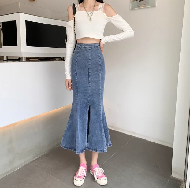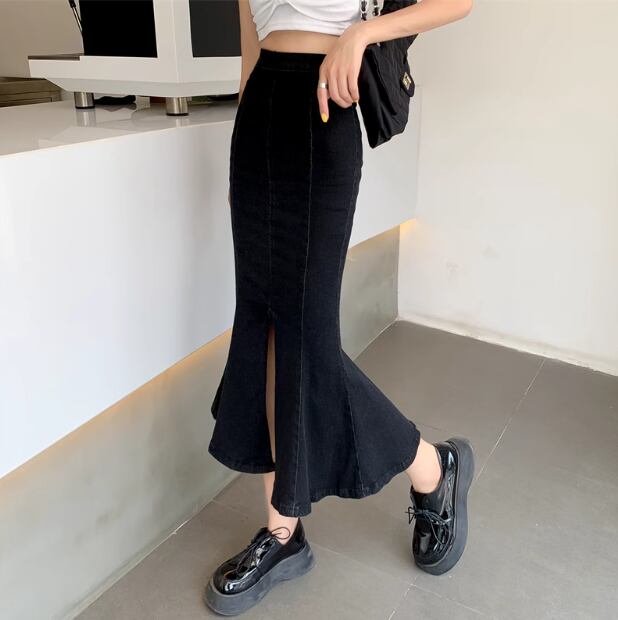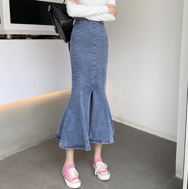 デニム ボトムス スカート ミモレ丈スカート フィッシュテールスカート ミモレ丈 タイト マーメイドスカート かわいい 大人可愛い きれいめ シンプル カジュアル 上品 おしゃれ かっこいい 大人女子 こなれ感 個性的 主役級 存在感 セクシー クール キュート 無地 オールシーズン レディース 女性用 OL 通勤 オフィス 学生 通学 デート お出かけ お泊まり イベント 女子会 休日 カフェ ショッピング 旅行 リゾート コンパ レストラン 普段使い 着回し 脚長 S M L ブルー ブラック