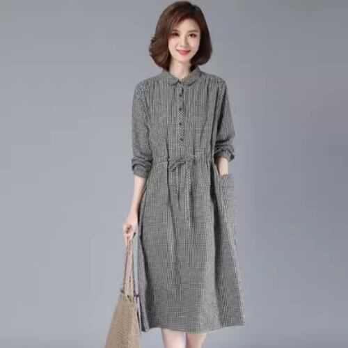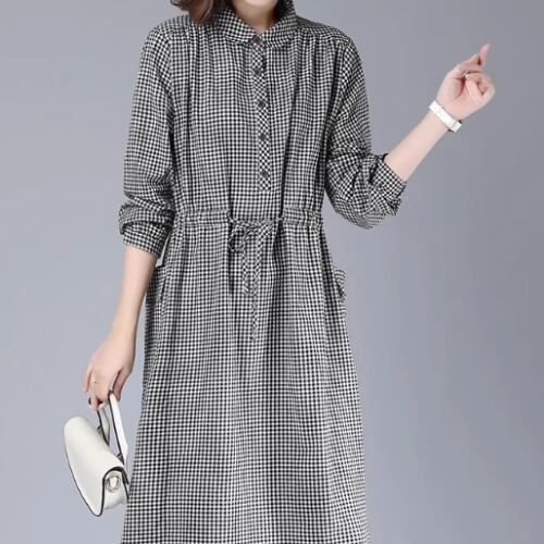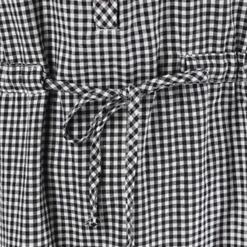 ワンピース レディース ミモレ丈 夏 5分袖 コットンリネン ギンガムチェック 夏ワンピース ミモレワンピース 綿 麻 柔らか 涼しい 配色 ナチュラル M L XL 2XL 大きいサイズ ブラック