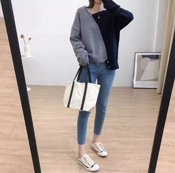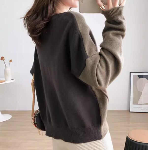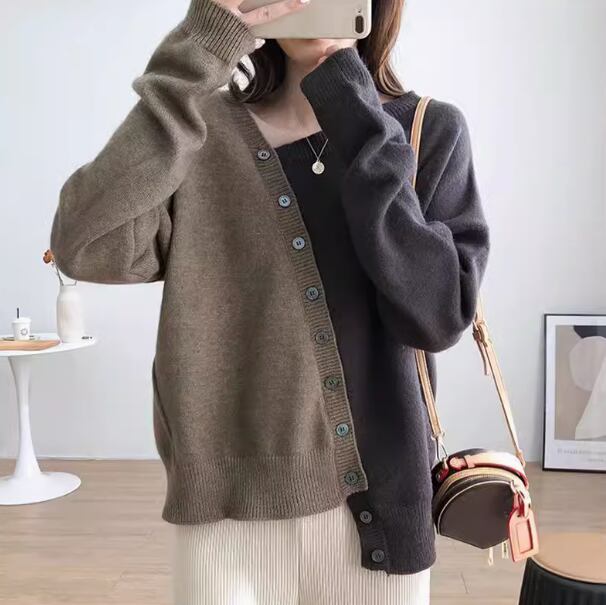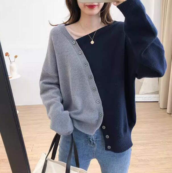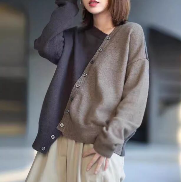 バイカラーデザイン カーディガン セーター ニット ボタンデザイン 前開き 無地 長袖 丸首 厚手 ゆったり シンプル カジュアル 春 秋 冬 2色 M L XL 2XL 3XL ブルー ブラウン