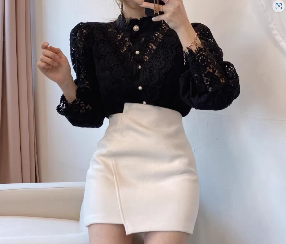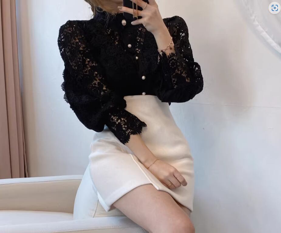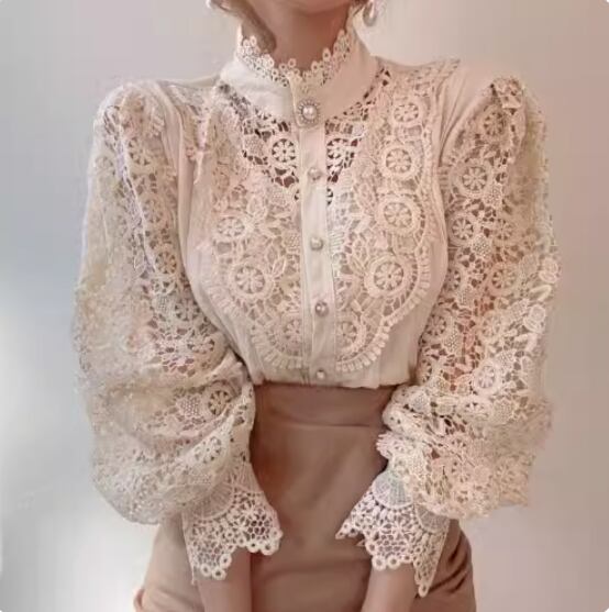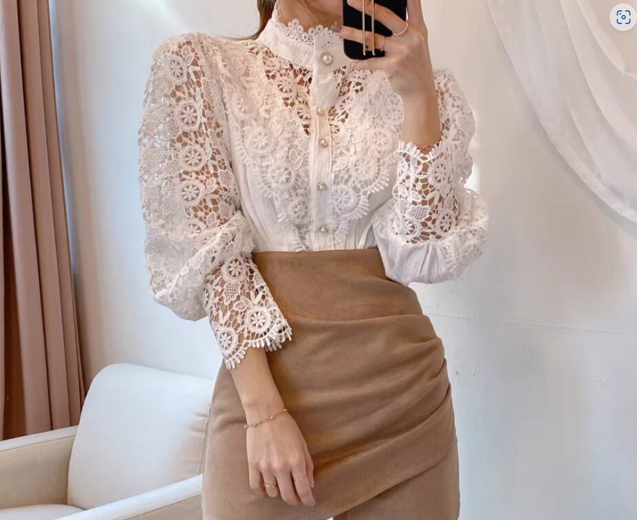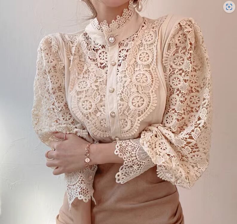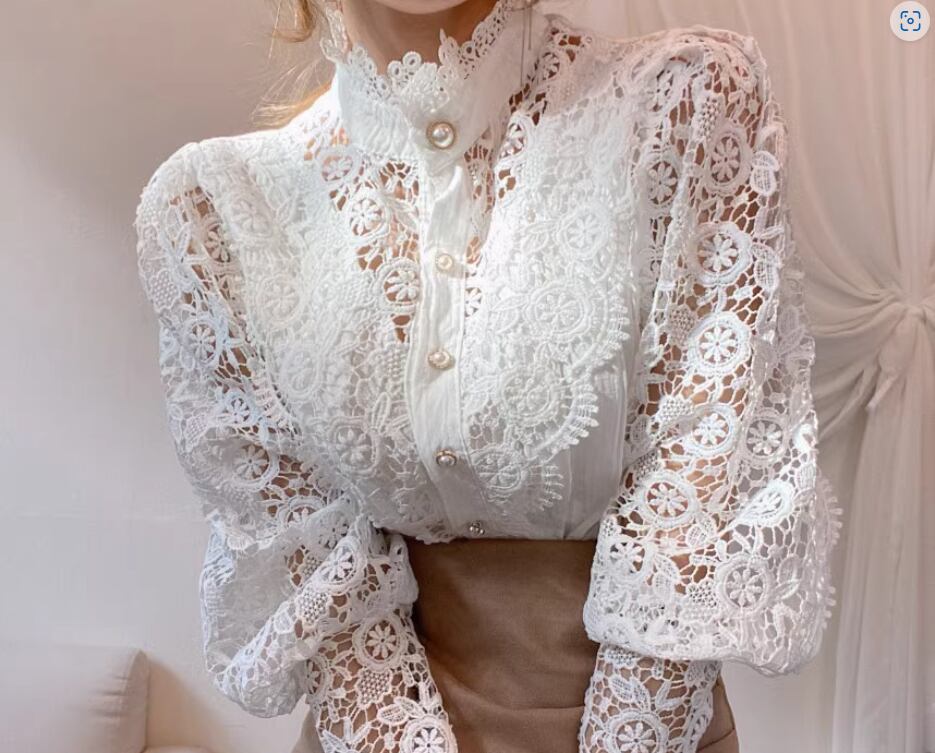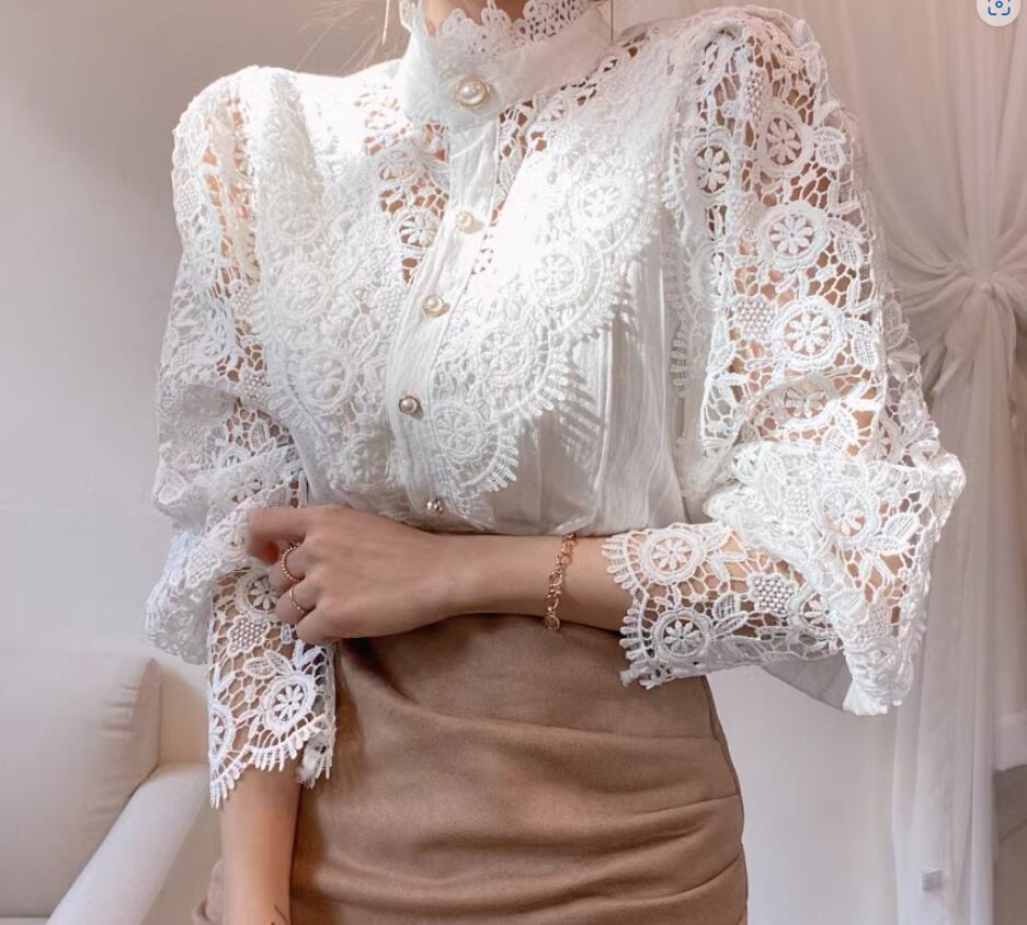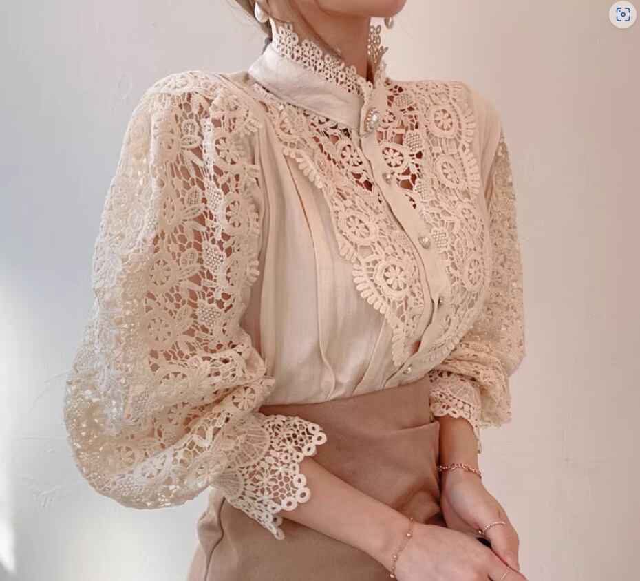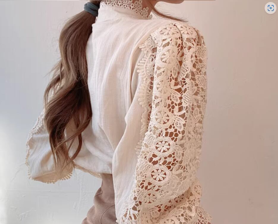 エレガントな透かし編みレースが目をひくブラウス
