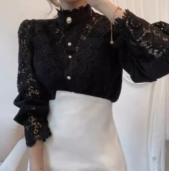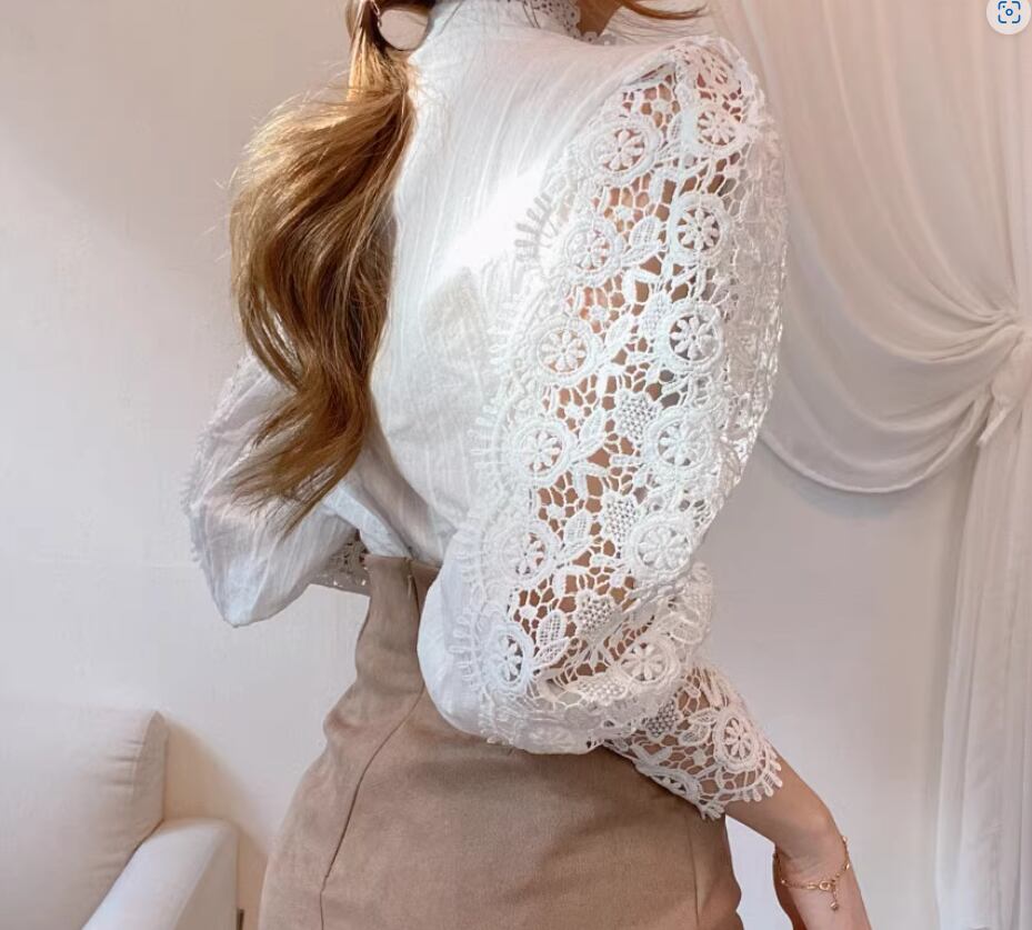 透かし編みレースブラウス 長袖 ボリューム袖 袖コンシャス スタンドカラー レース かわいい 大人可愛い きれいめ シンプル 大人 上品 おしゃれ お洒落 大人女子 こなれ感 エレガント フラワー 春 秋 入学式 入園式 卒業式 卒園式 謝恩会 20代 30代 40代 レディース 女性用 ママ お出かけ 休日 着回し 普段使い S M L XL 2XL 白 ホワイト 黒 ブラック アプリコット