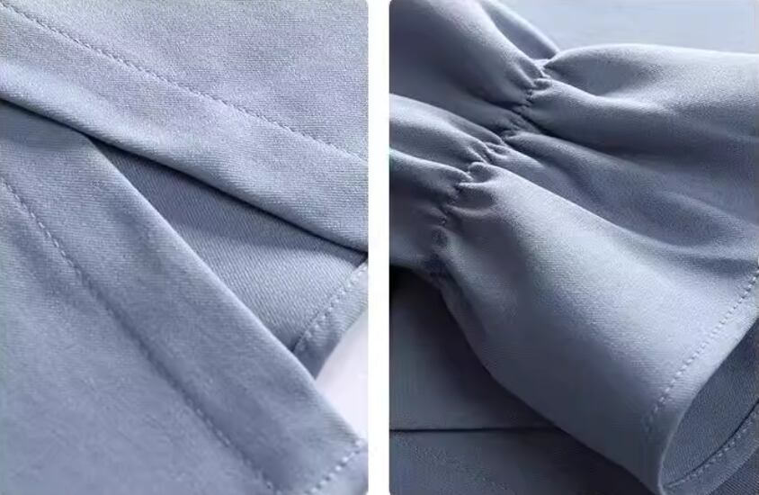 アシンメトリーな襟とギャザー袖がアクセント