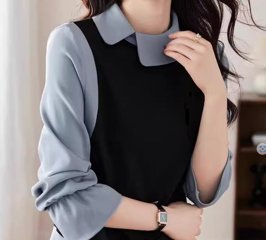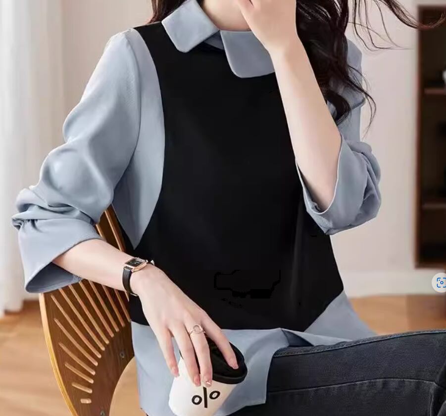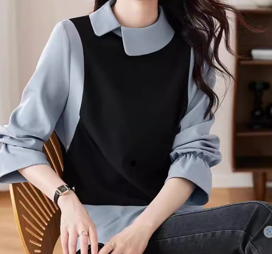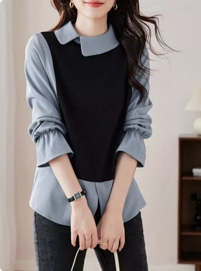 ブルー×ブラックの重ね着風デザインがおしゃれな長袖ブラウス