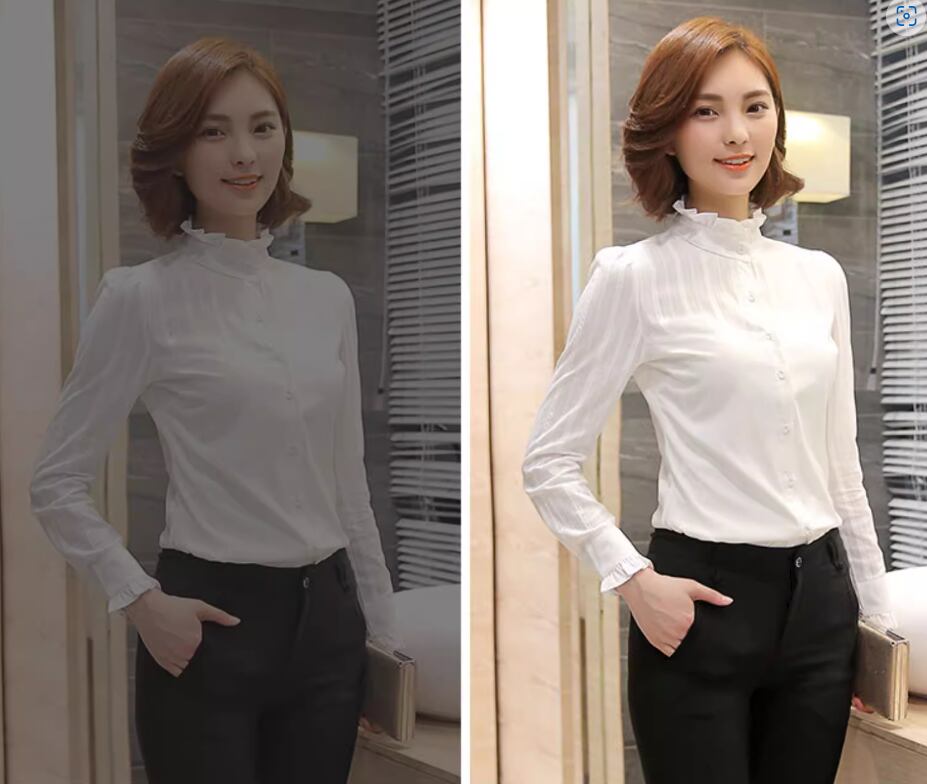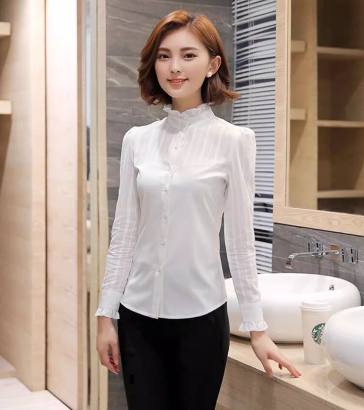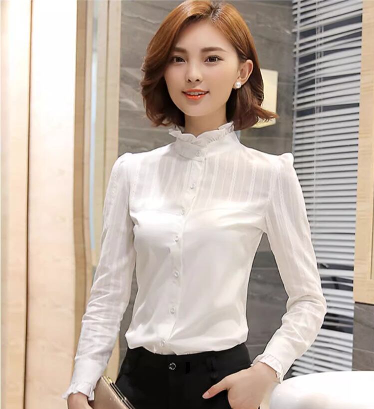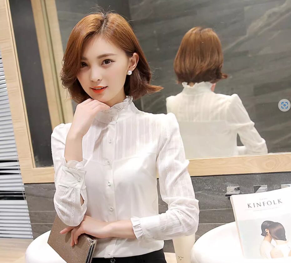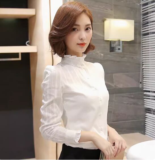 スタンドカラーとパフスリーブが華やかな長袖ブラウス