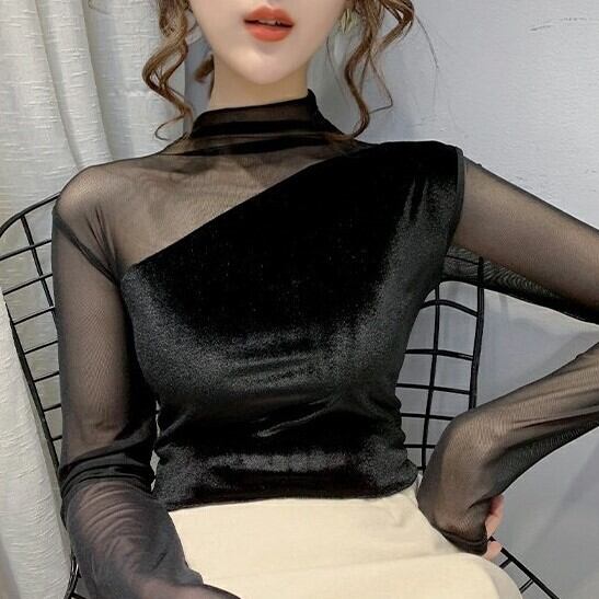 レディース トップス プルオーバー 長袖 ハーフタートルネック スリム 細身 ストレート 透け感 シースルー ベルベット かわいい 大人可愛い きれいめ シンプル カジュアル 上品 おしゃれ ガーリー エレガント ラブリー キュート 無地 春 秋 デート お出かけ パーティー イベント 女子会 カフェ 韓国 コーデ 普段使い 着回し モテ トレンド 流行 インスタ映え S M L XL 2XL ブラック