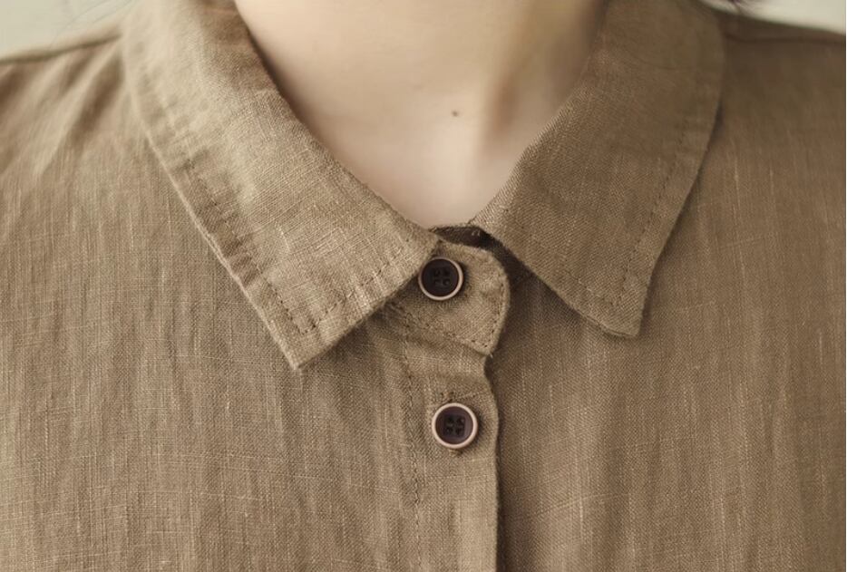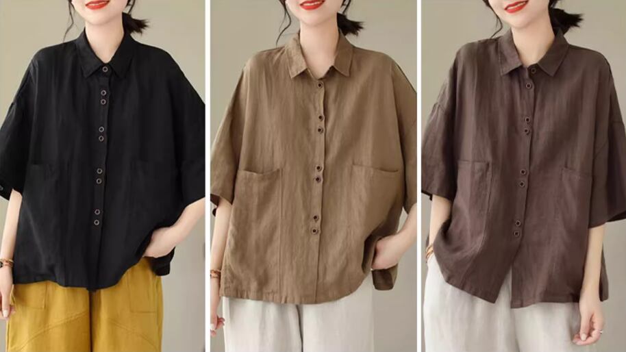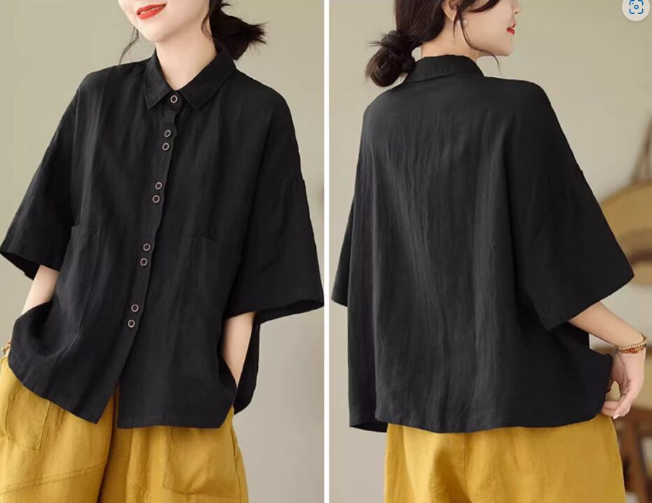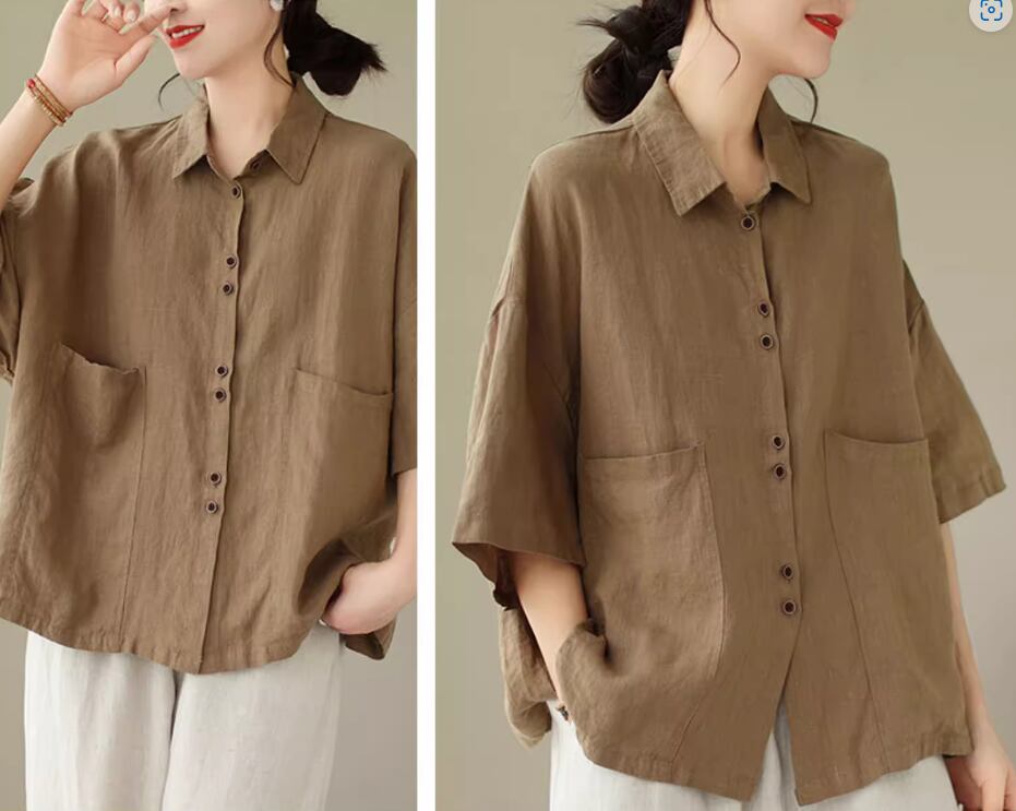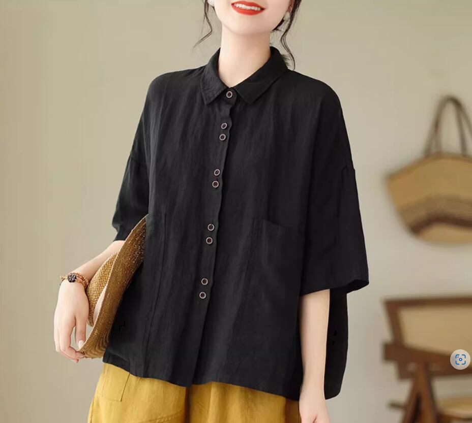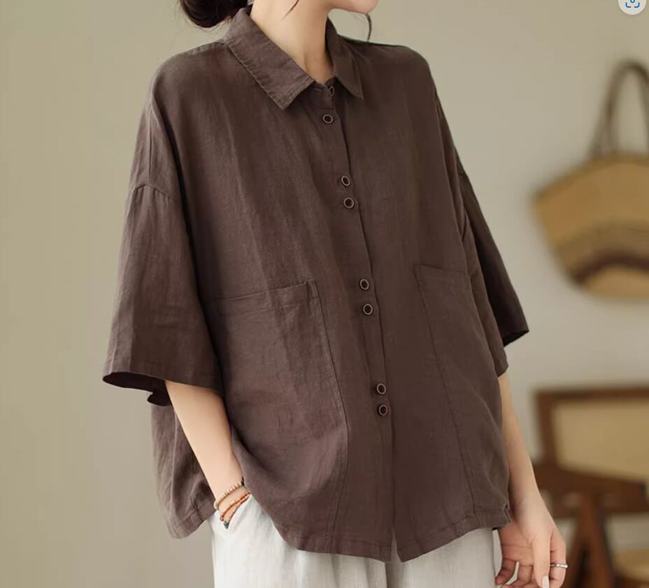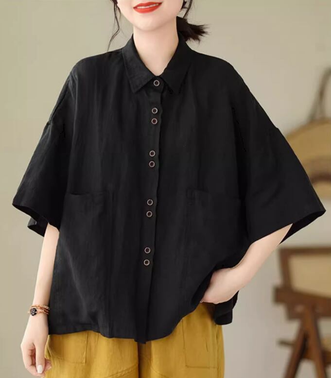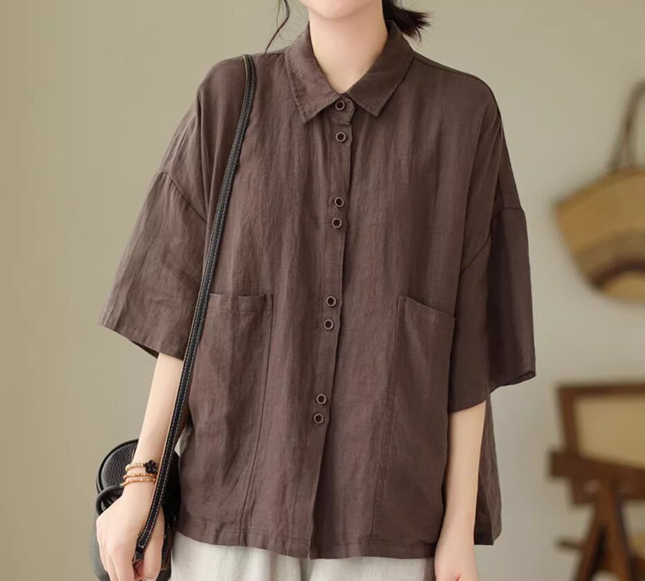 綿麻半袖シャツ 半袖 5分袖 五分袖 ドロップショルダー 襟付き ストレート ワイド 綿 麻 リネン シンプル カジュアル 大人 レトロ ラフ 無地 春 夏 20代 30代 40代 レディース 女性用 お出かけ 休日 旅行 着回し 普段使い M L XL 2XL 黒 ブラック 茶色 ブラウン カーキ