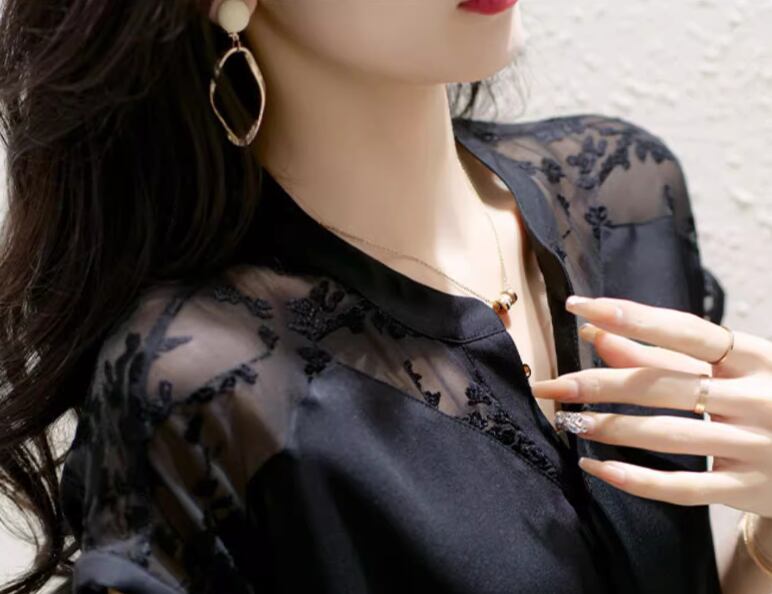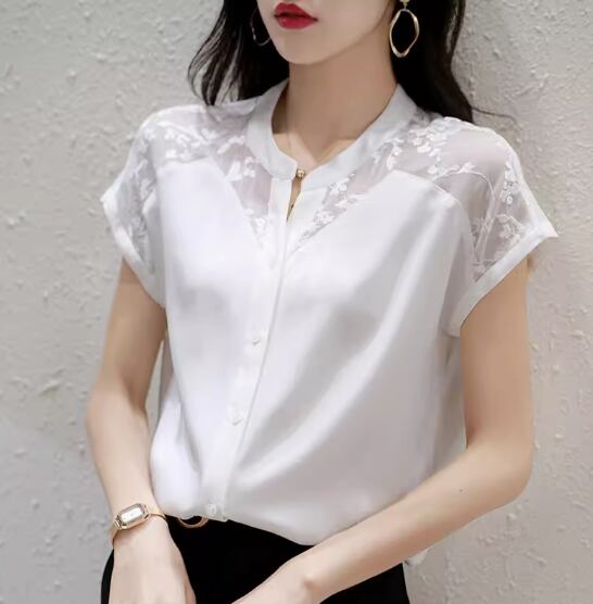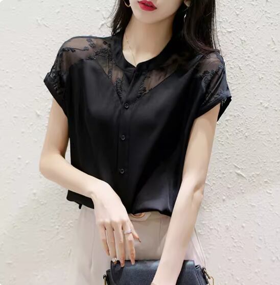 レースデザインシアーブラウス トップス シャツ 半袖 スタンドカラー ストレート シフォン 透け感 シースルー 薄手 かわいい 大人可愛い きれいめ シンプル カジュアル 大人 上品 おしゃれ お洒落 大人女子 こなれ感 とろみ感 無地 春 夏 20代 30代 40代 レディース 女性用 OL 通勤 お出かけ 休日 着回し 普段使い 重ね着 S M L XL 2XL 白 ホワイト 黒 ブラック
