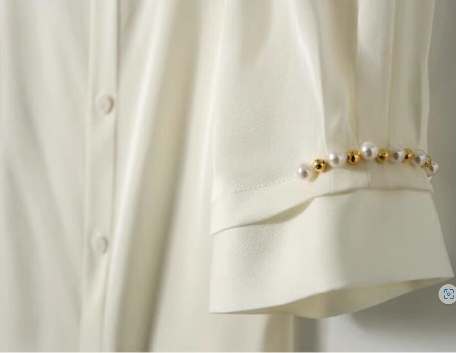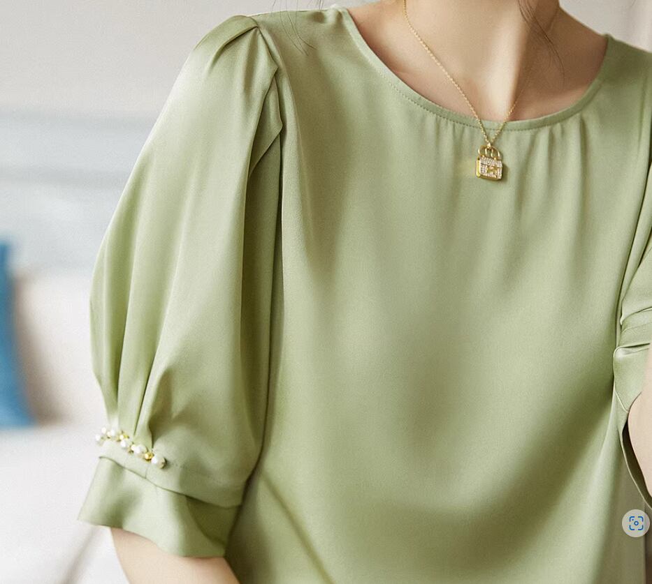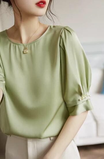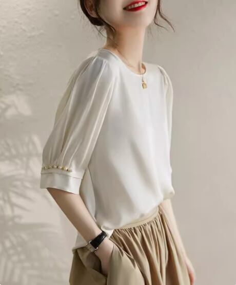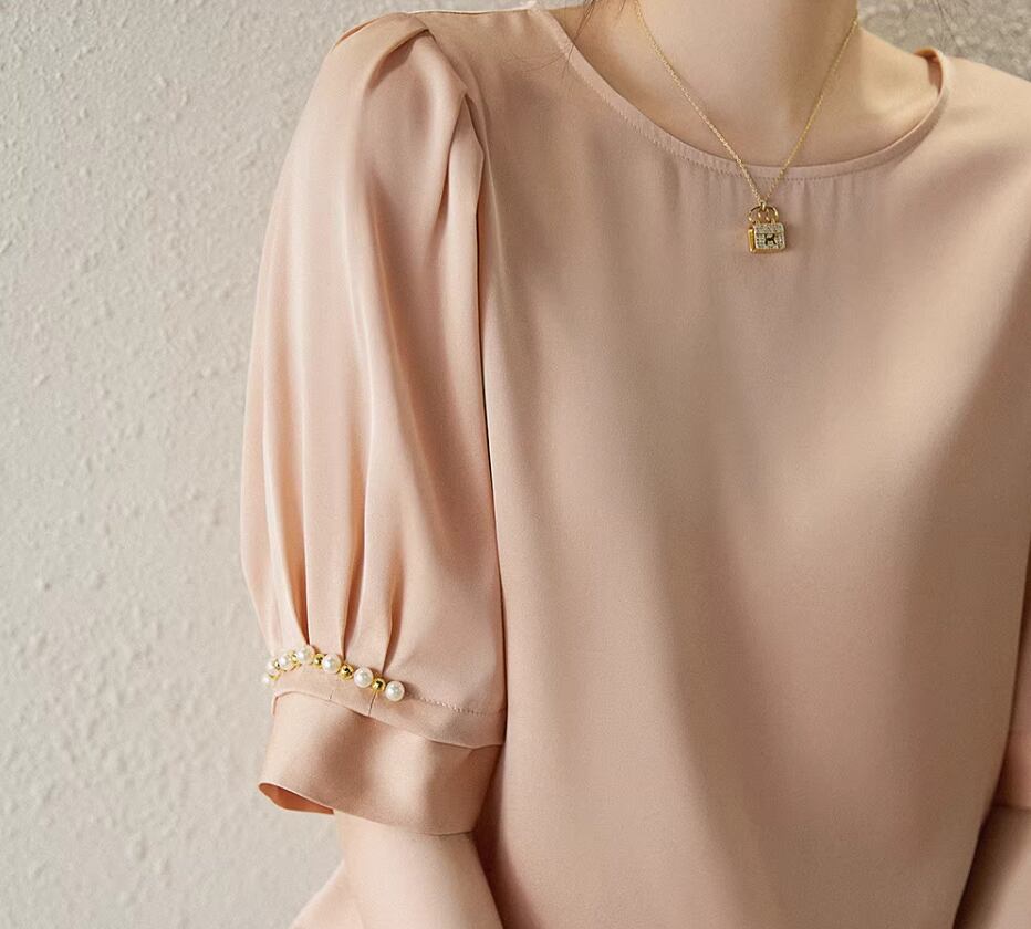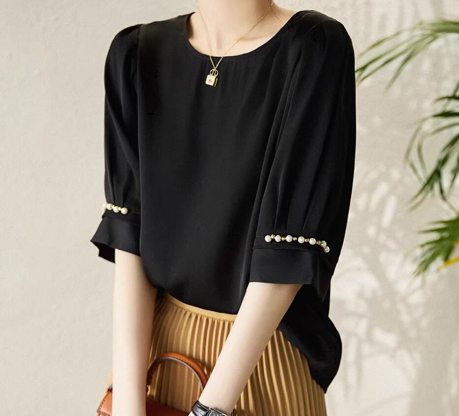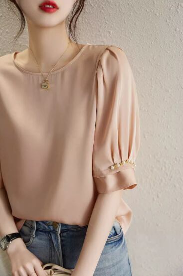 ツヤのある質感と袖のビジューがおしゃれな半袖ブラウス