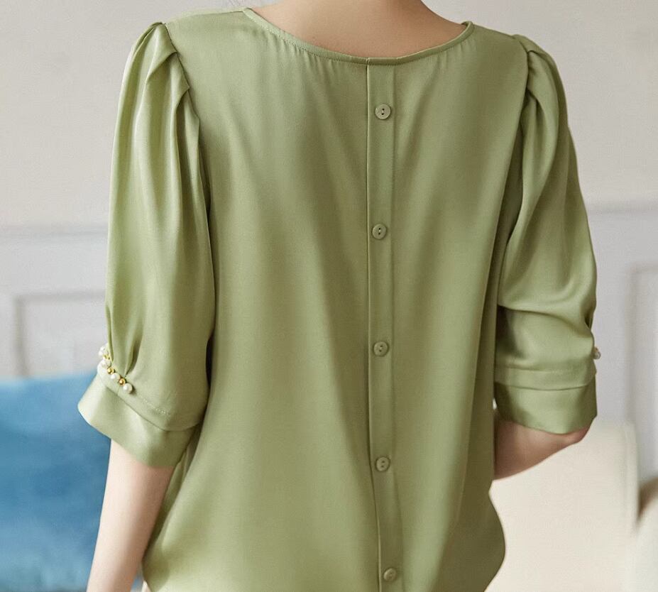 袖ビジュー付き半袖ブラウス トップス バックボタン 半袖 袖コンシャス ラウンドネック ストレート バックコンシャス 大人可愛い きれいめ シンプル カジュアル 大人 上品 おしゃれ お洒落 大人女子 エレガント とろみ感 無地 春 夏 20代 30代 40代 レディース 女性用 お出かけ 休日 着回し 普段使い M L XL 2XL 白 ホワイト 黒 ブラック 緑 グリーン ピンク