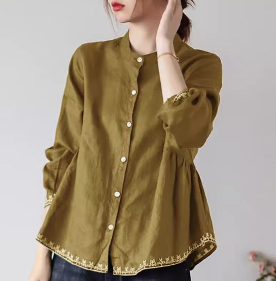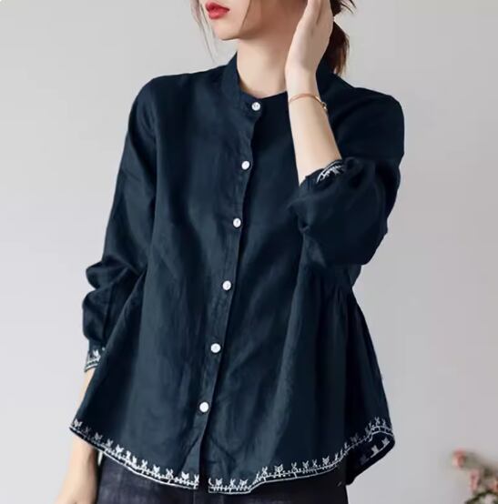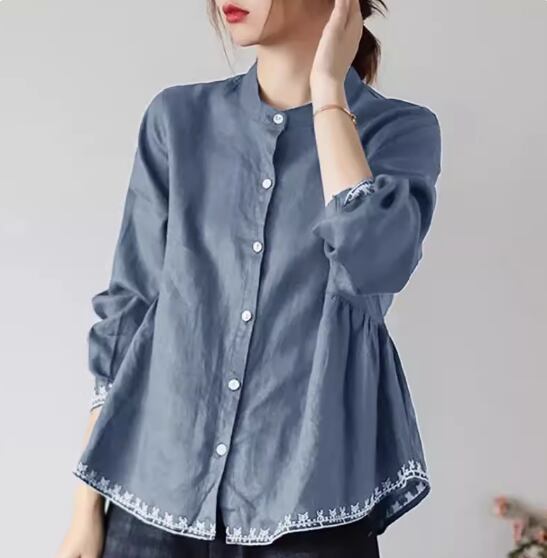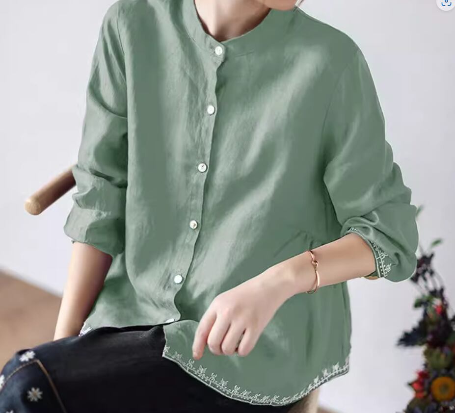裾刺繍長袖ブラウス トップス 長袖 スタンドカラー 刺繍 かわいい 大人可愛い シンプル カジュアル おしゃれ お洒落 レトロ 無地 春 夏 秋 10代 20代 30代 40代 レディース 女性用 お出かけ 休日 着回し 普段使い M L XL 2XL 青 ブルー 緑 グリーン 黄色 イエロー ネイビー