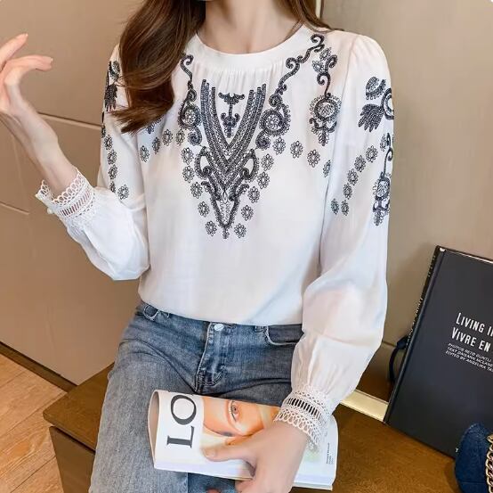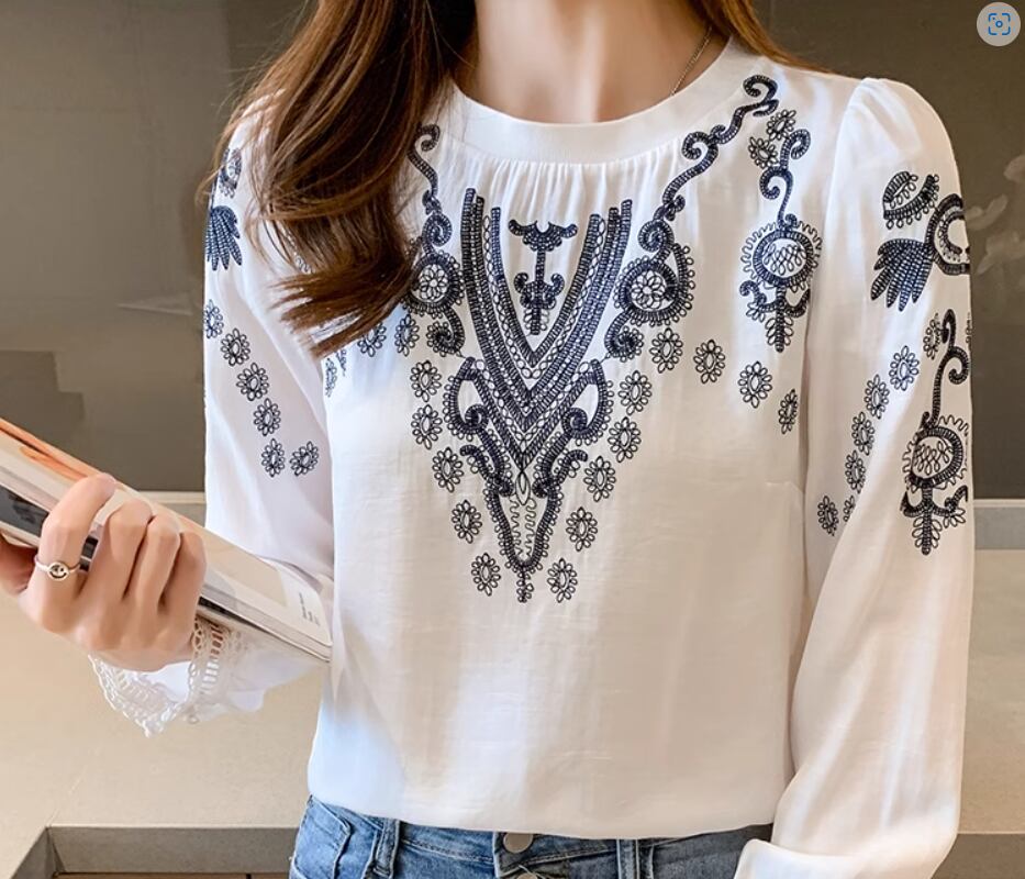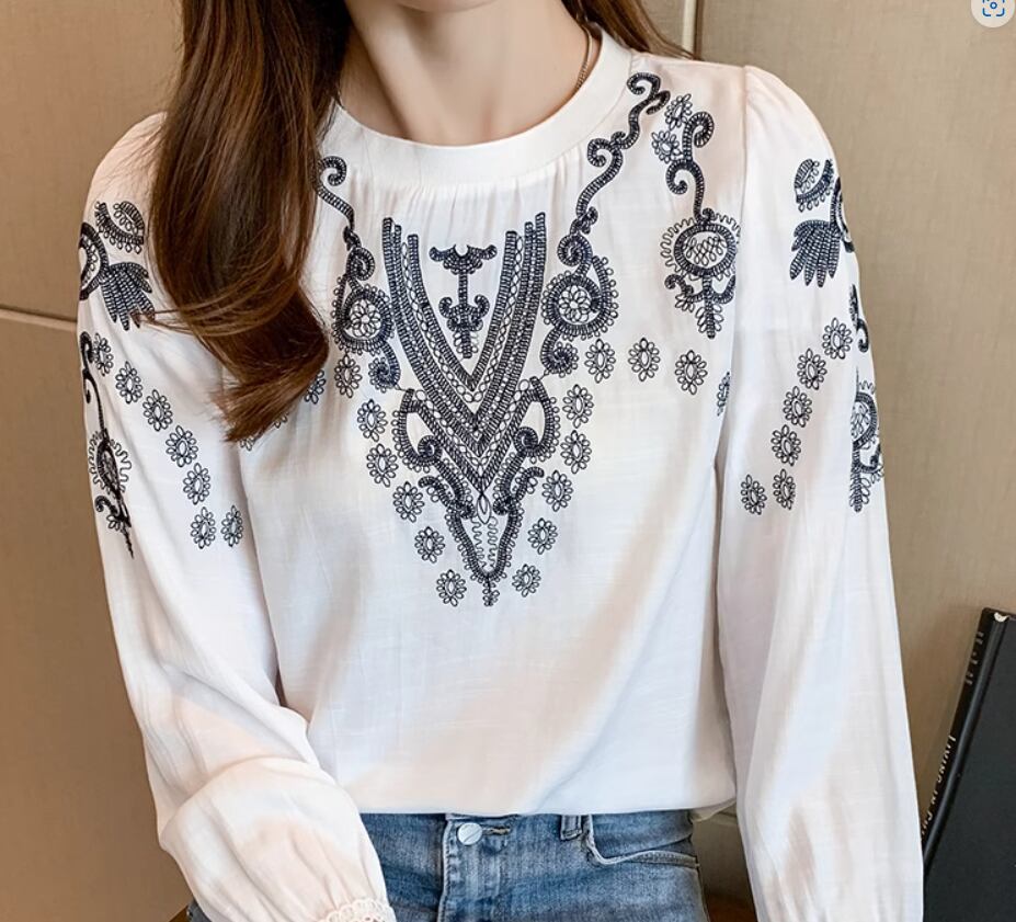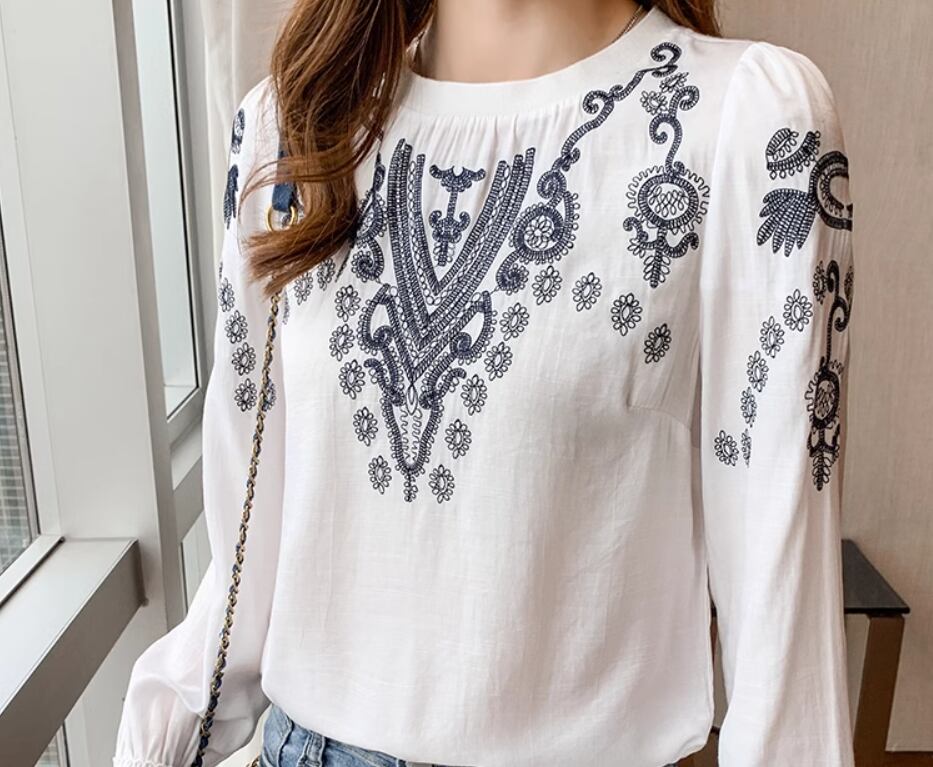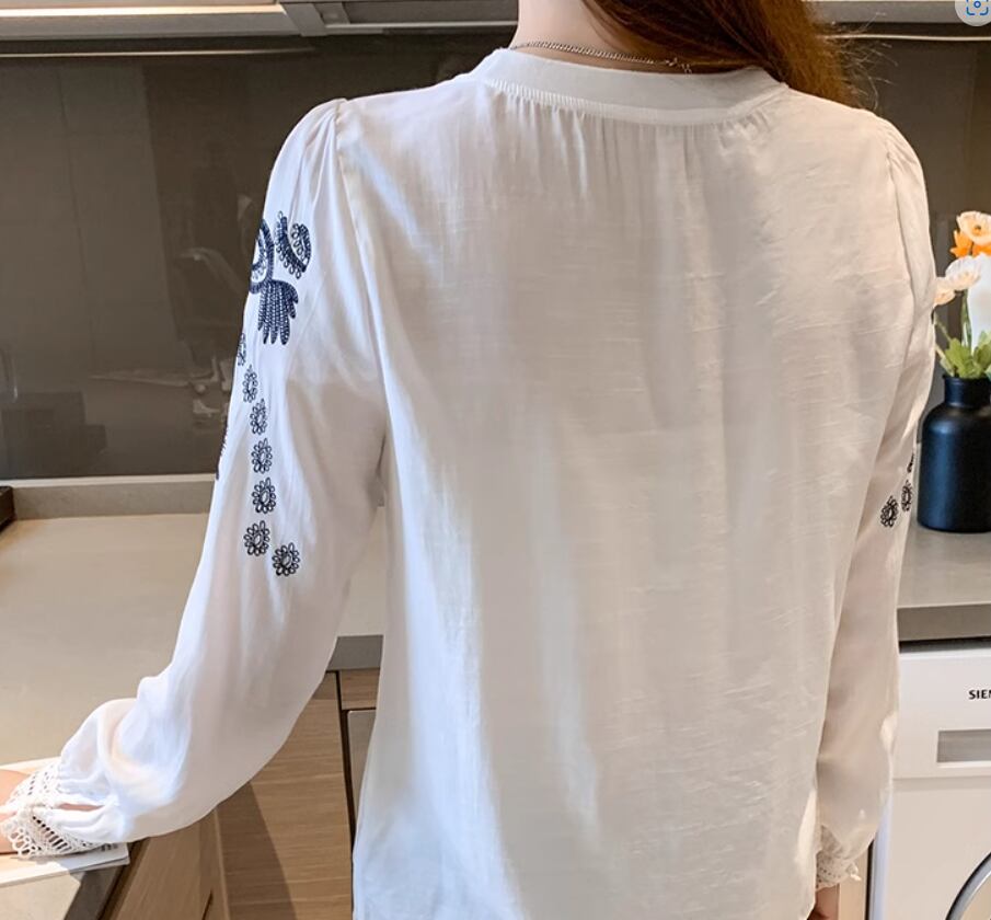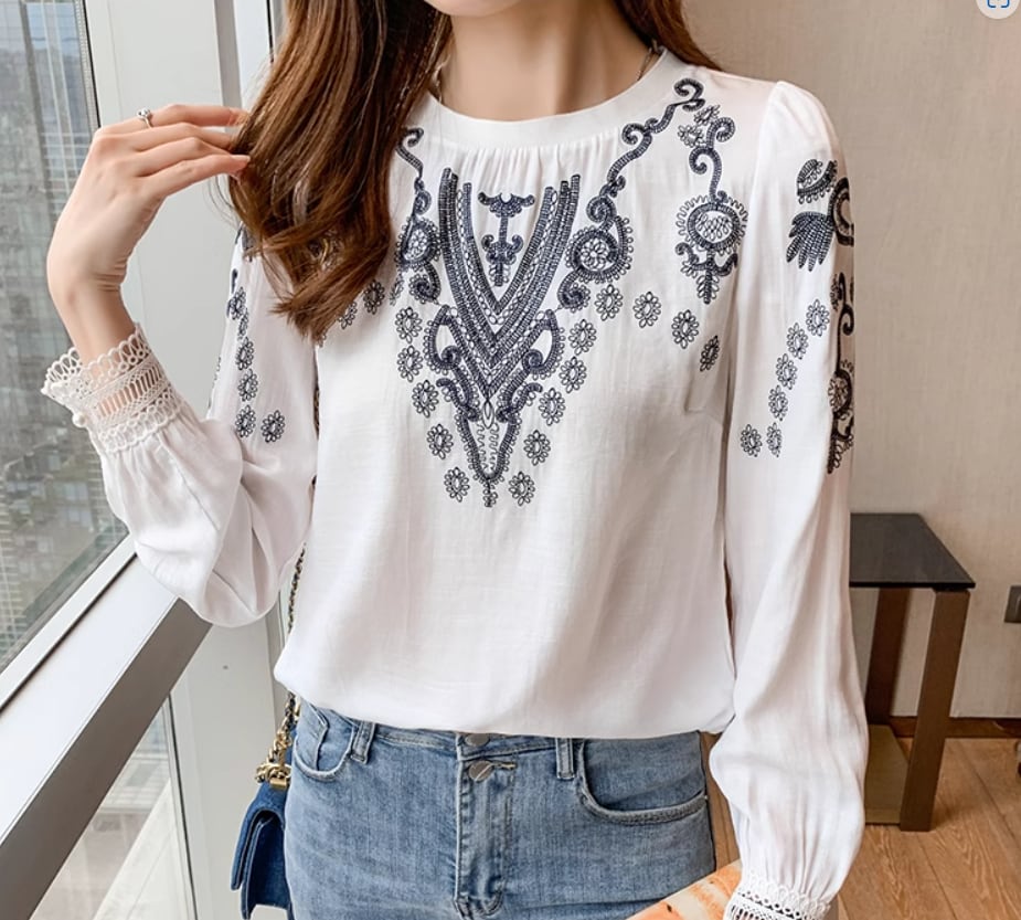 レトロな刺繍デザインとレースの袖口がおしゃれな長袖ブラウス