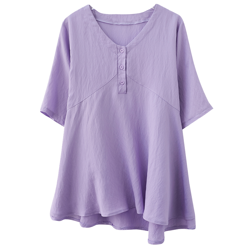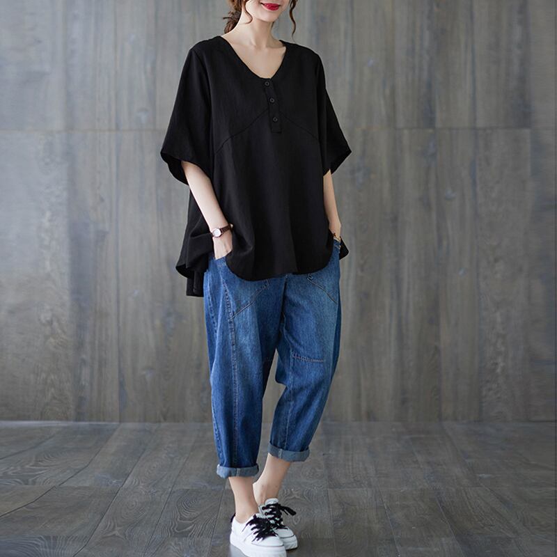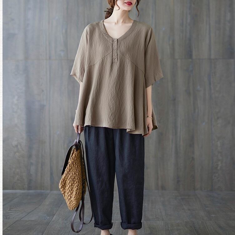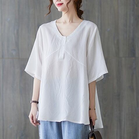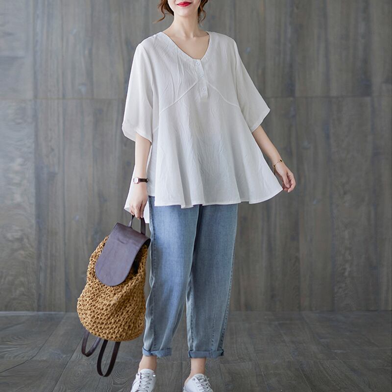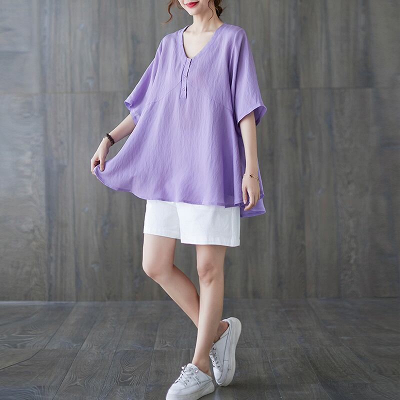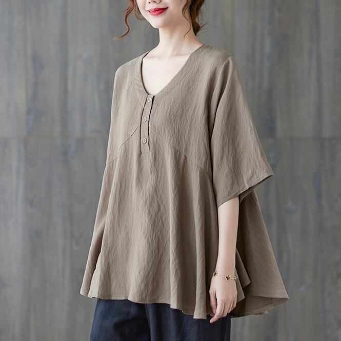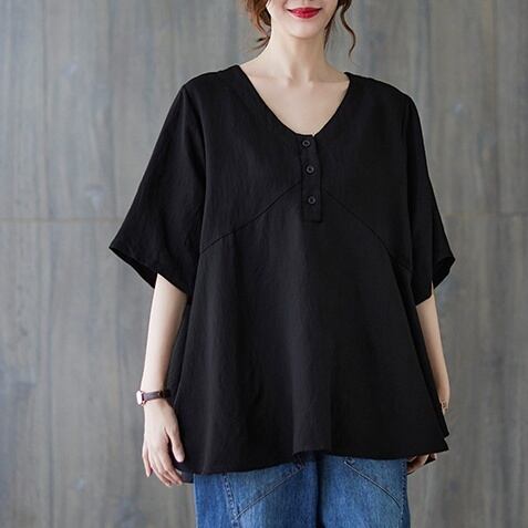 トップス ブラウス プルオーバー ミディアム丈 5分袖 Vネック ハーフボタン かわいい 大人可愛い きれいめ シンプル 上品 おしゃれ かっこいい レトロ ラフ ルーズ きちんと こなれ感 個性的 主役級 存在感 抜け感 春 夏 ナチュラル ベーシック キュート クール メンズライク 無地 レディース 女性用 ママ マタニティ OL 通勤 学生 通学 デート お出かけ お泊まり イベント 女子会 休日 カフェ ショッピング レストラン コンパ レイヤード 重ね着 普段使い 着回し L XL ゆったり