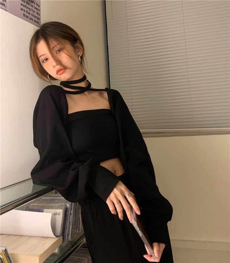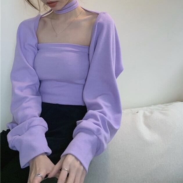 トップス カットソー カーディガン アンサンブル インナー セットアイテム レディース 長袖 ボリューム袖 チューブトップ ホルターネック ワイド タイト スリム 細身 背中開き リボン かわいい 大人可愛い シンプル カジュアル おしゃれ こなれ感 ラフ ガーリー ルーズ 個性的 クール 存在感 抜け感 キュート 無地 春 夏 学生 デート お出かけ 休日 ショッピング 合コン コンパ お揃い 双子 韓国 オルチャン コーデ 楽ちん トレンド 流行 インスタ映え フリーサイズ 黒 ブラック 紫 パープル