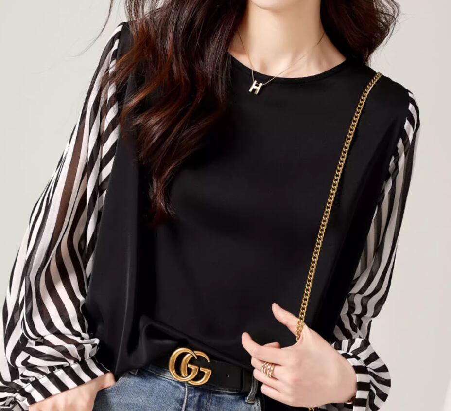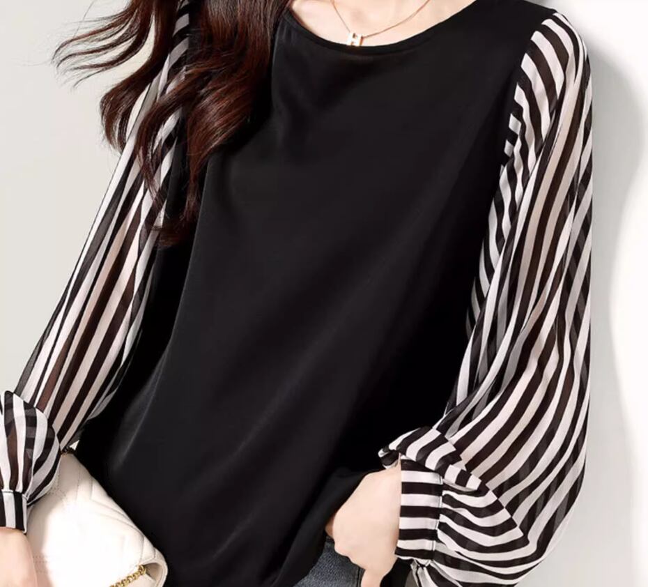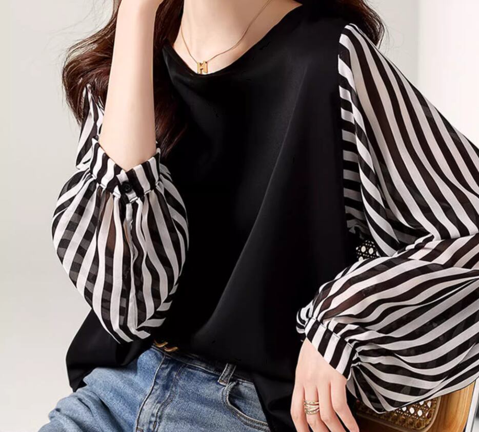 無地×ストライプブラウス トップス プルオーバー 長袖 ボリューム袖 ラウンドネック ストレート シフォン 切り替えデザイン 透け感 大人可愛い シンプル カジュアル おしゃれ お洒落 大人女子 個性的 存在感 とろみ感 無地 ストライプ 春 夏 秋 10代 20代 30代 40代 レディース 女性用 ママ お出かけ 休日 着回し 普段使い 楽ちん S M L XL 2XL 黒 ブラック
