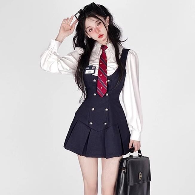 セットアップ 上下セット 制服風 トップス シャツ ショート丈 長袖 ネクタイ ミニスカート プリーツスカート ミニ丈 ジャンパースカート かわいい 大人可愛い きれいめ シンプル 上品 おしゃれ かっこいい レトロ きちんと こなれ感 個性的 主役級 存在感 抜け感 オールシーズン ナチュラル ベーシック キュート クール メンズライク ガーリー レディース 女性用 学生 通学 デート お出かけ お泊まり イベント 女子会 休日 コスプレ ハロウィン レイヤード 重ね着 普段使い 着回し S M L