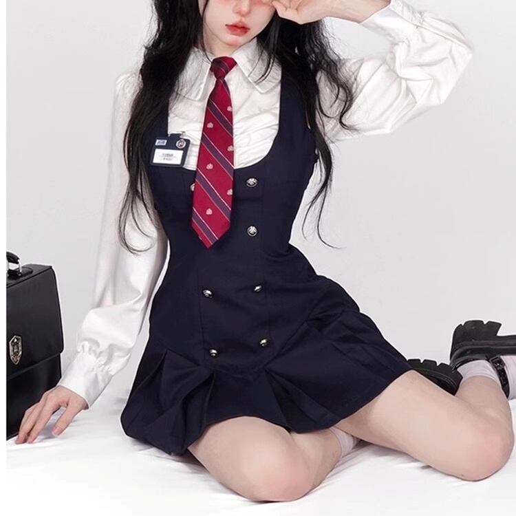 トップスのシャツはショート丈で、ネクタイとミニスカートがセットになっています。