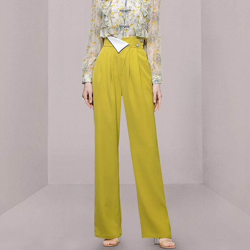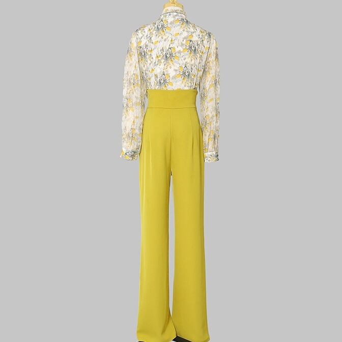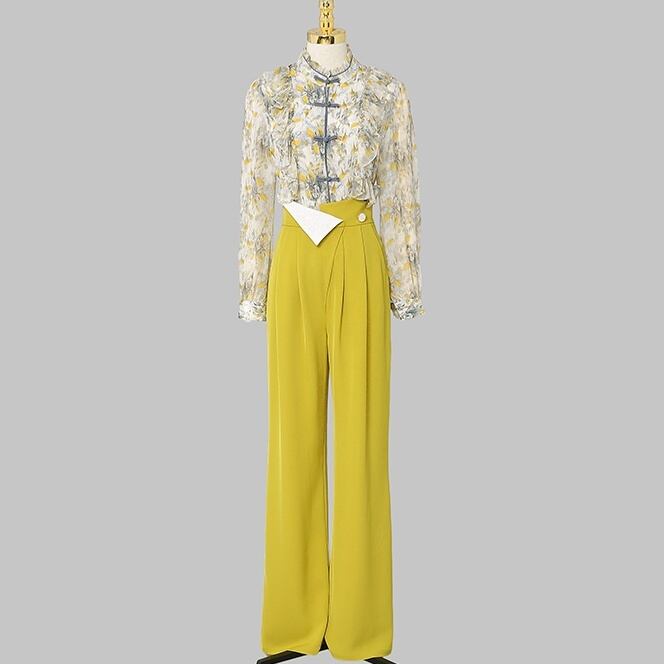 ハイネックのフリルブラウスとデザインボタンがポイントのハイウエストロングパンツのセットです。