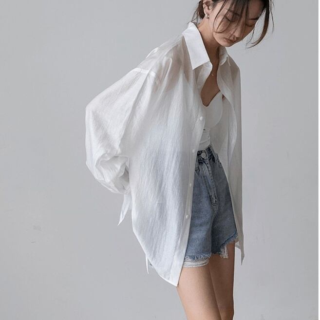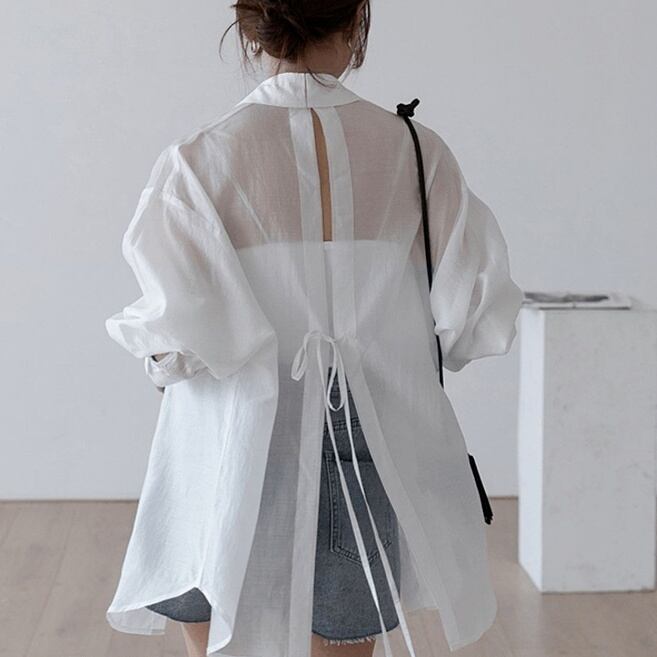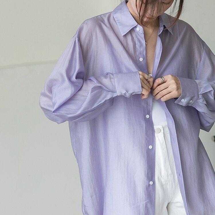 トップス シャツ ミディアム丈 長袖 角襟 前開き ボタン シースルー 薄手 バックシャン かわいい 大人可愛い きれいめ シンプル 上品 おしゃれ かっこいい レトロ こなれ感 個性的 主役級 存在感 抜け感 春 夏 ナチュラル ベーシック キュート クール メンズライク 無地 レディース 女性用 ママ OL 通勤 オフィス 学生 通学 デート お出かけ お泊まり イベント 女子会 休日 アウトドア カフェ ショッピング レストラン コンパ レイヤード 重ね着 普段使い 着回し S M L XL