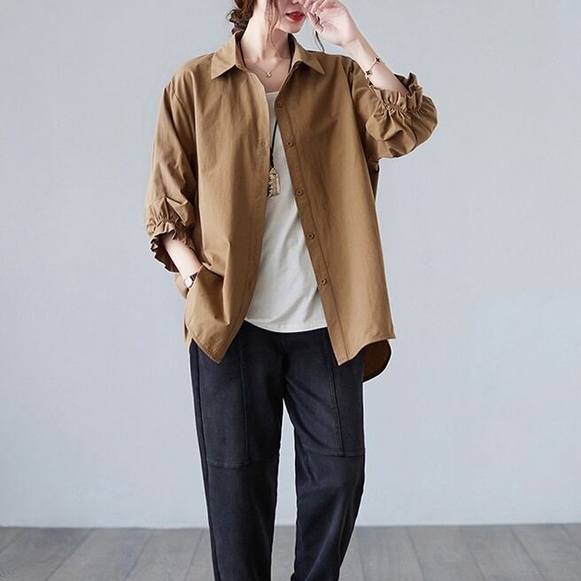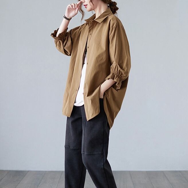 シンプルで上品なデザインのミディアム丈シャツです。
