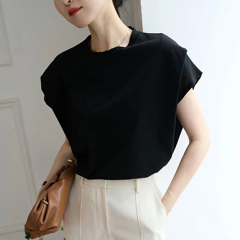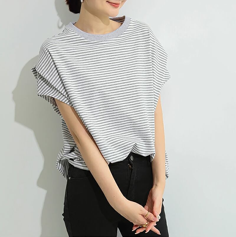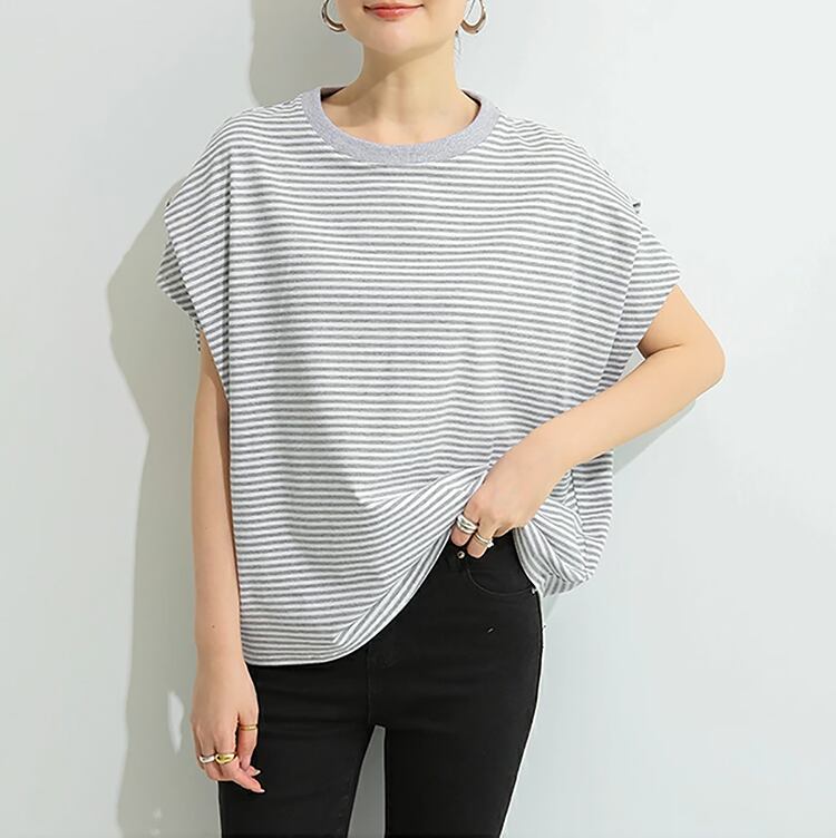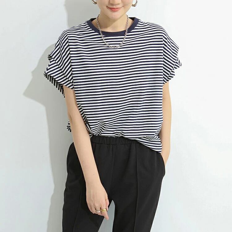 ラウンドネックと半袖のデザインは、着まわしの利きやすさが魅力です。