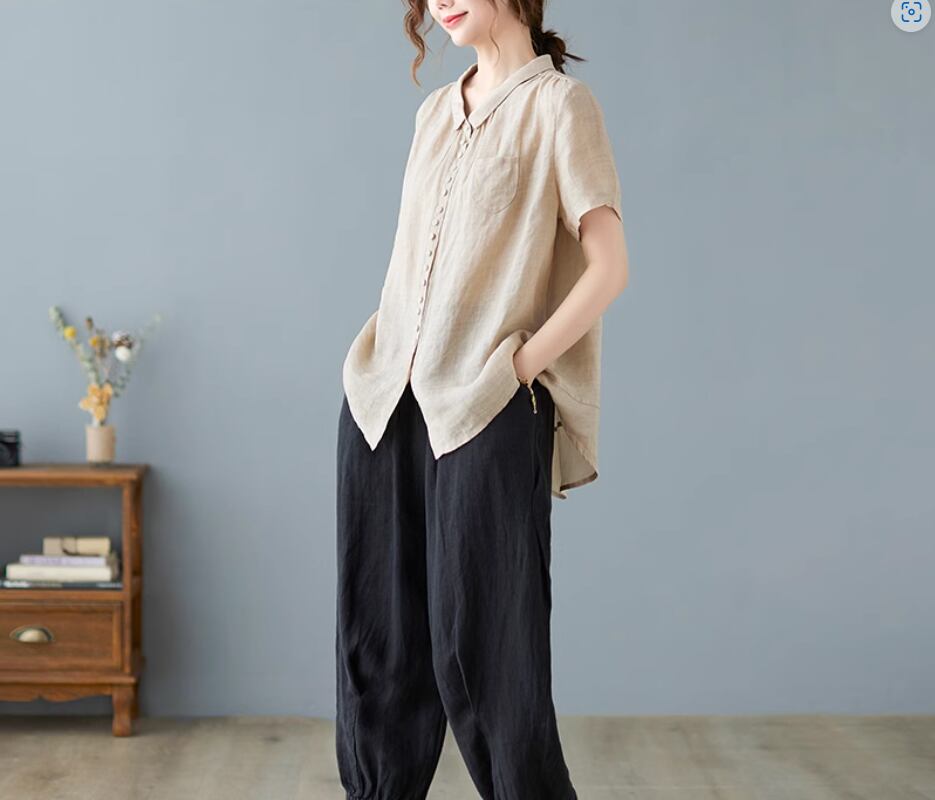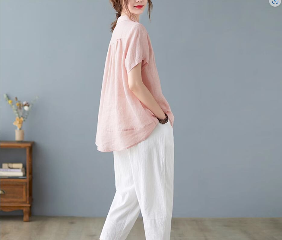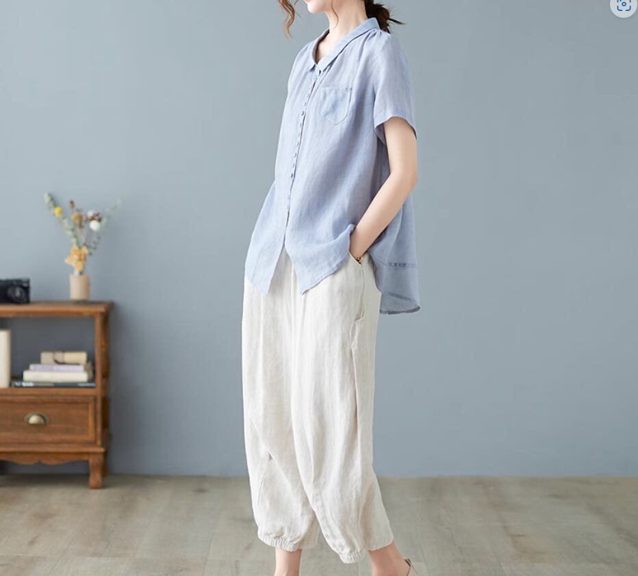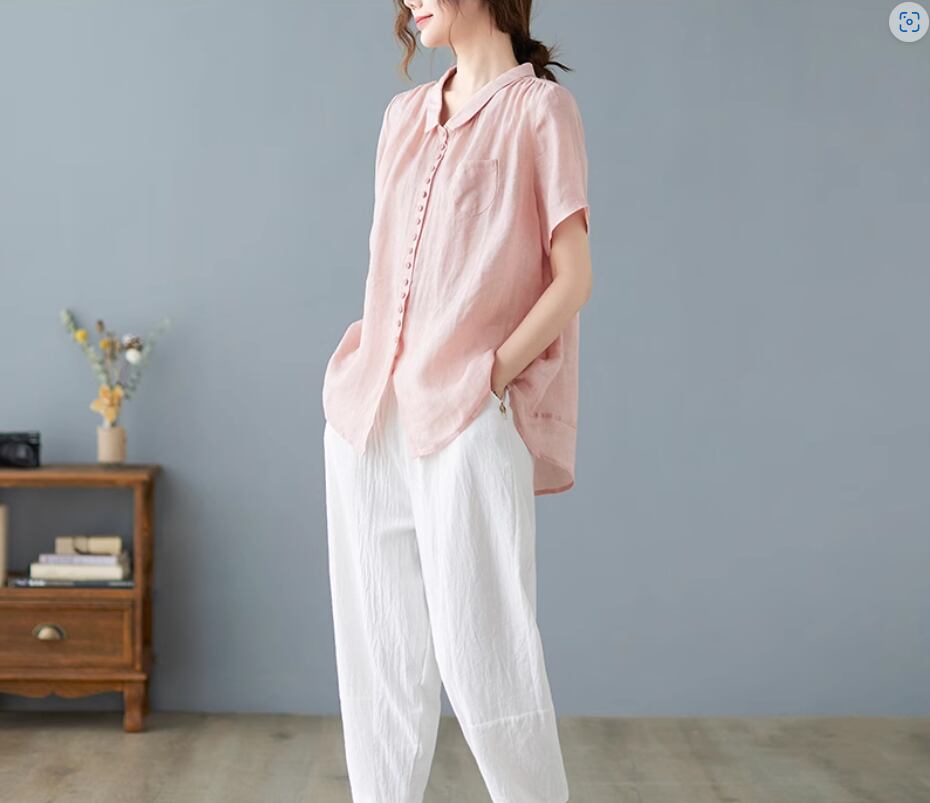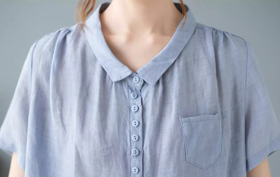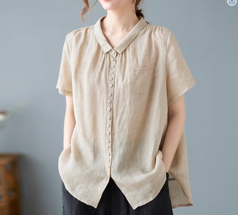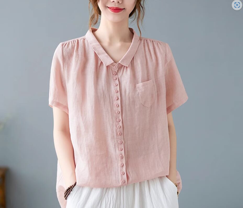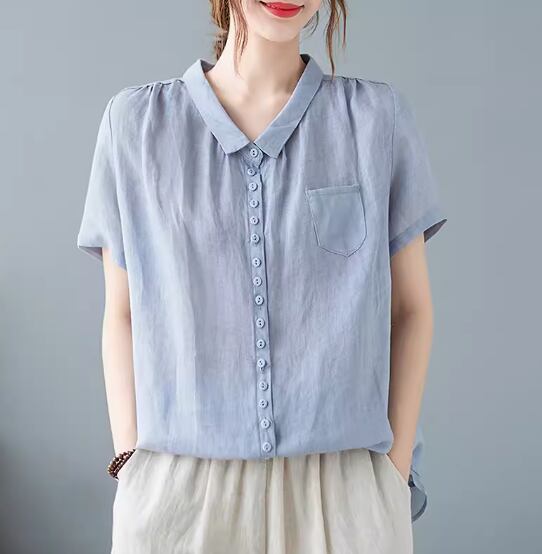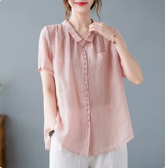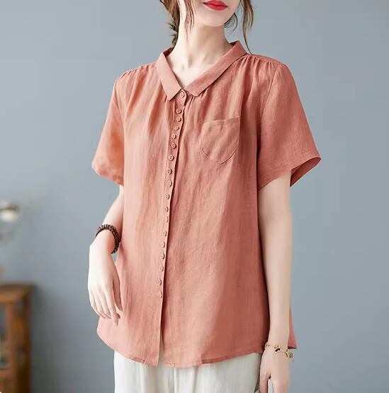 ボタンデザイン半袖シャツ トップス シャツ 半袖 襟付き ストレート 透け感 麻 リネン 薄手 かわいい シンプル カジュアル とろみ感 無地 春 夏 10代 20代 30代 40代 レディース 女性用 ママ お出かけ 休日 着回し 普段使い 楽ちん M L XL 2XL 青 ブルー カーキ ピンク オレンジ