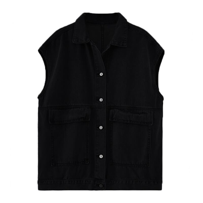 このデニムベストは、ミディアム丈で前開きの襟付きデザインが特徴的。
