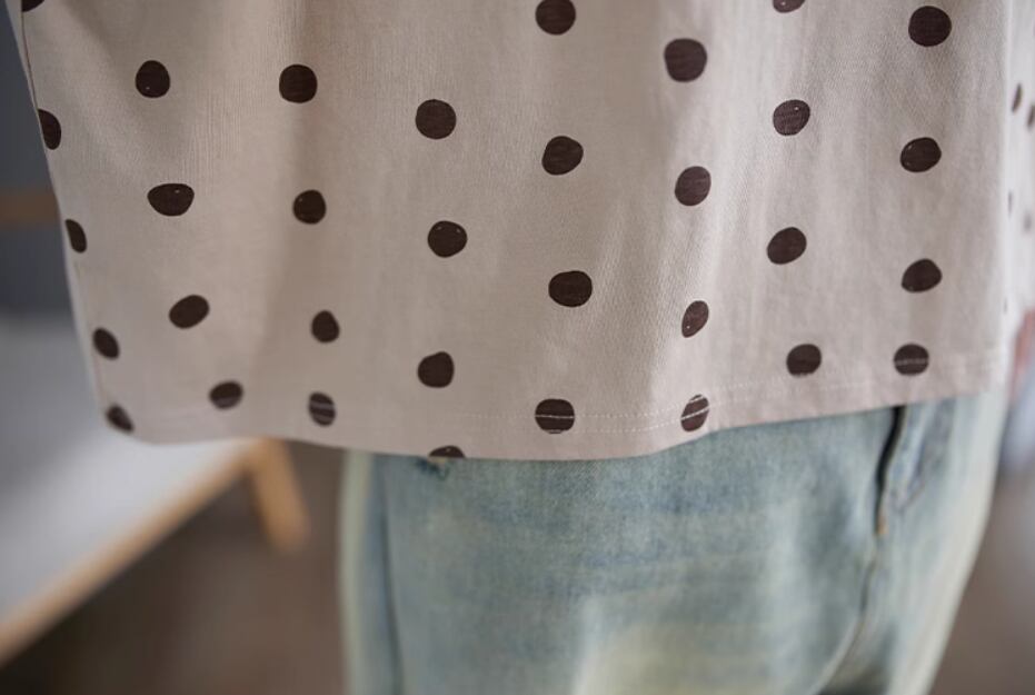 ランダムドット柄が大人可愛く、カジュアルからフェミニンまで着まわせる1枚
