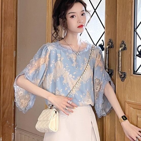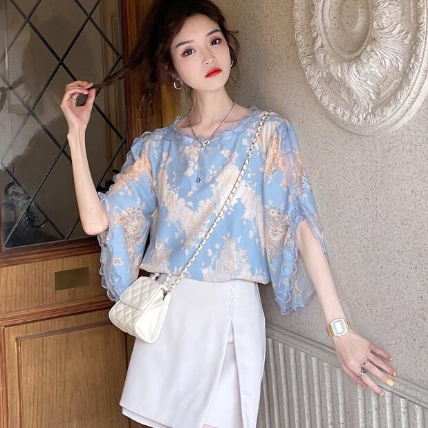 トップス ブラウス ミディアム丈 プルオーバー 半袖 ボリューム袖 ラウンドネック フリル シースルー かわいい 大人可愛い きれいめ シンプル 上品 おしゃれ かっこいい レトロ きちんと こなれ感 個性的 主役級 存在感 抜け感 春 夏 ナチュラル ベーシック キュート レディース 女性用 ママ OL 通勤 オフィス 学生 通学 デート お出かけ お泊まり イベント 女子会 休日 アウトドア カフェ ショッピング レストラン コンパ レイヤード 重ね着 普段使い 着回し S M L XL モテ