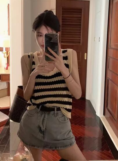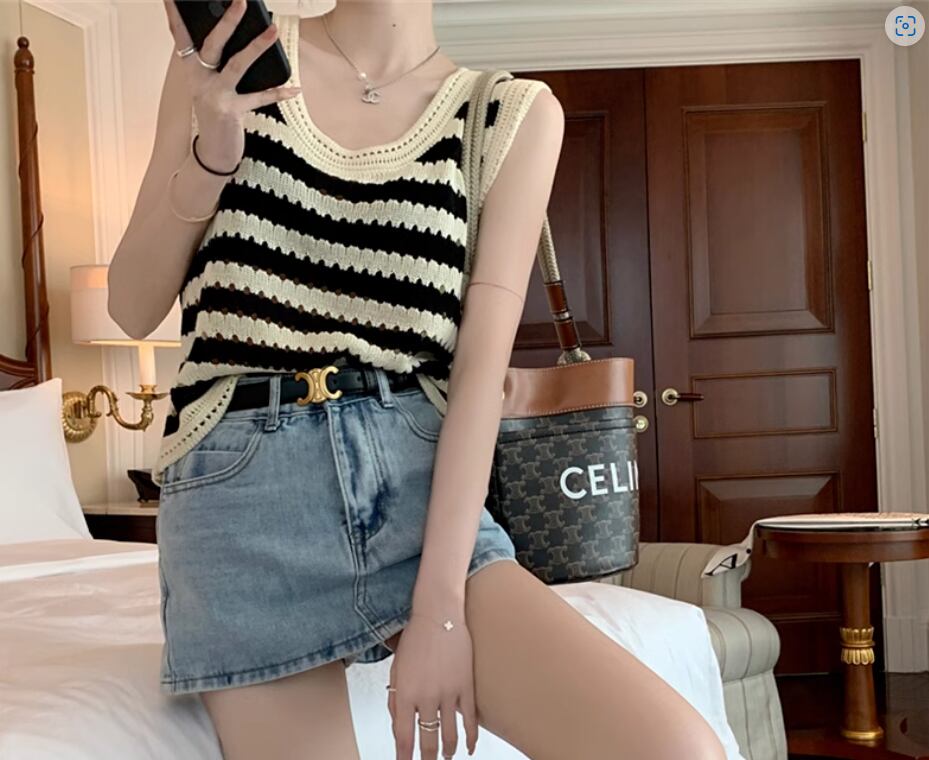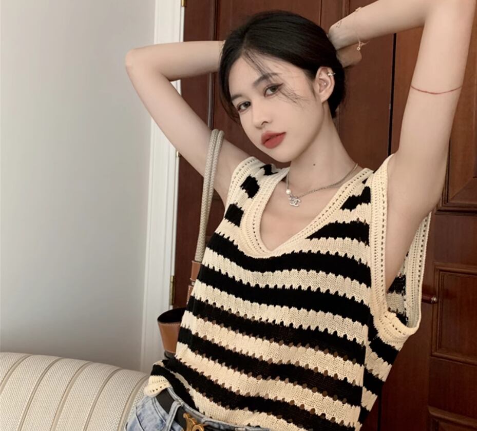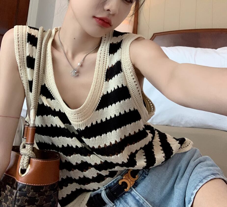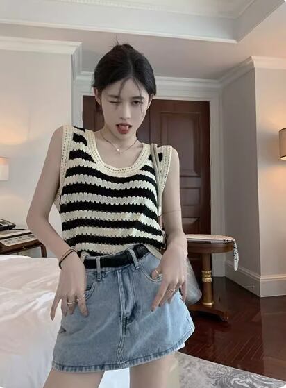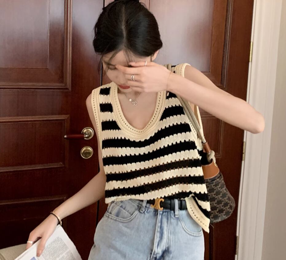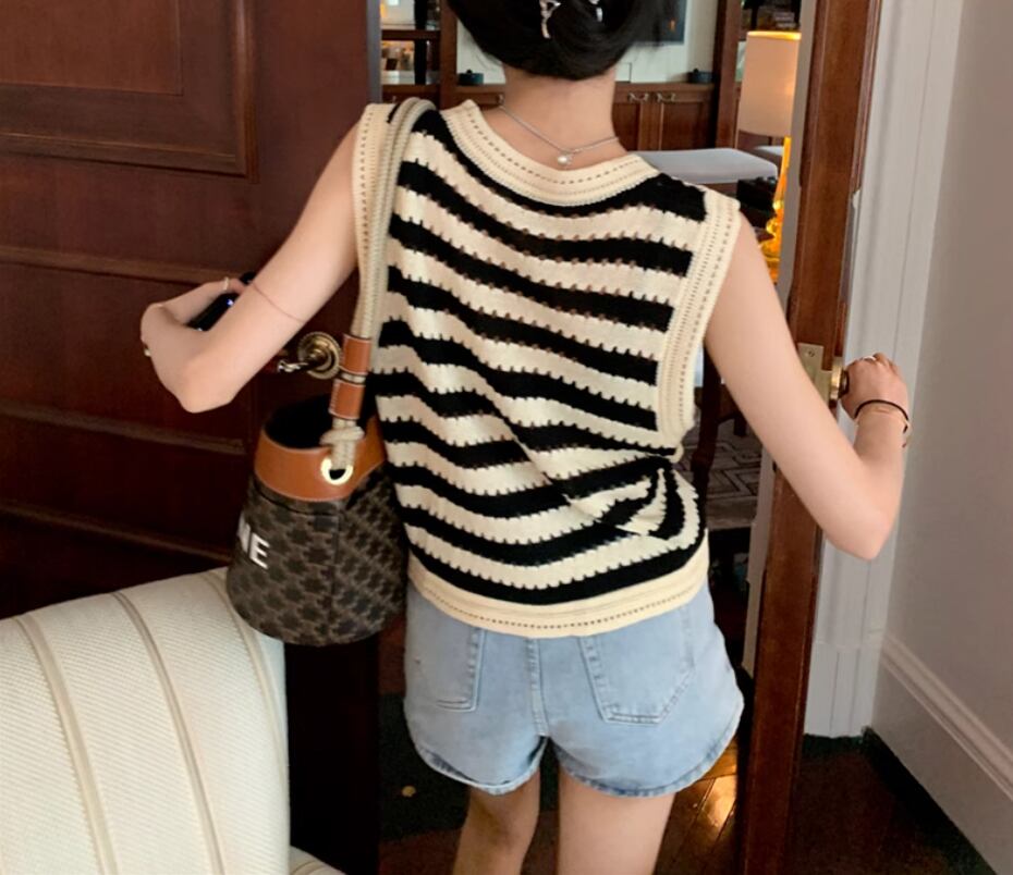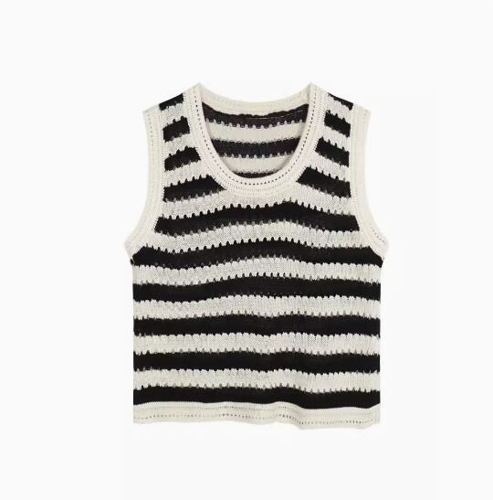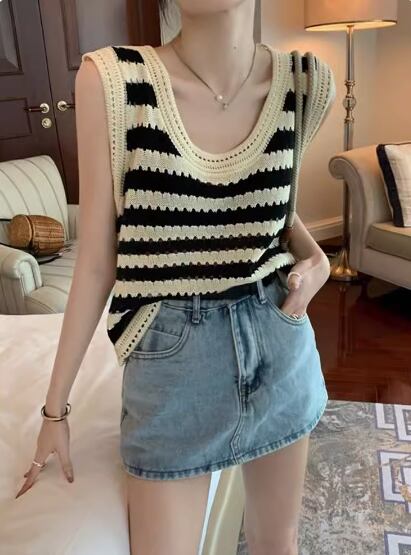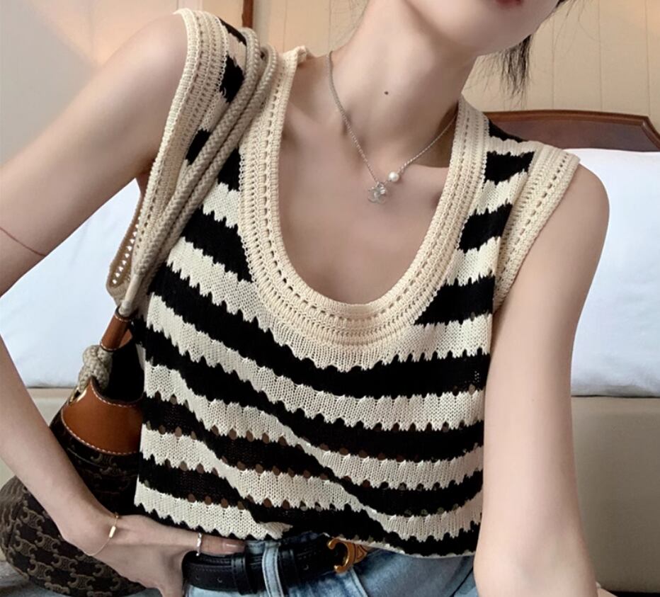 トップス プルオーバー ニットベスト ノースリーブ ラウンドネック ストレート 伸縮性 かわいい 大人可愛い シンプル カジュアル おしゃれ お洒落 レトロ こなれ感 存在感 ボーダー 春 夏 秋 10代 20代 30代 40代 レディース 女性用 お出かけ 休日 イベント リゾート 旅行 着回し 普段使い 重ね着 楽ちん S M L XL 2XL 黒 ブラック