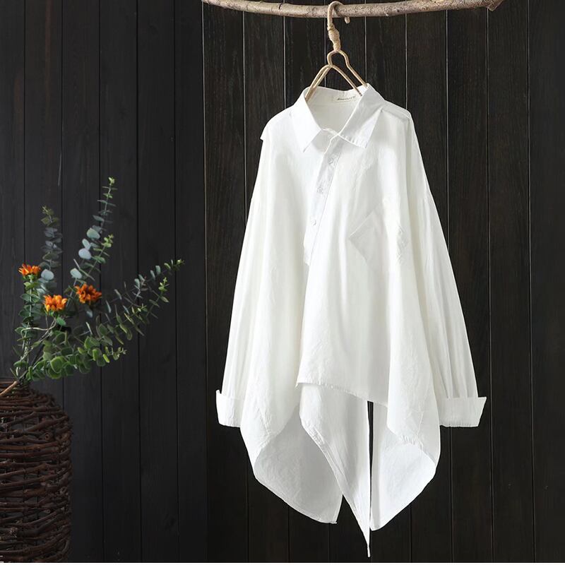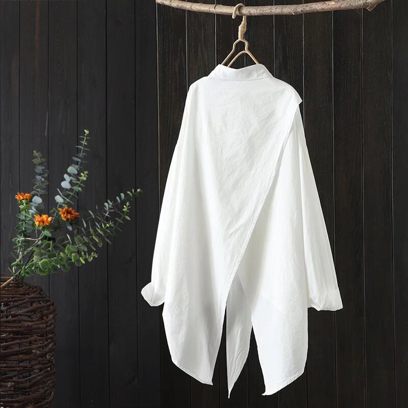 トップス シャツ ミディアム丈 長袖 角襟 前開き ボタン アシンメトリー バックスリット かわいい 大人可愛い きれいめ シンプル 上品 おしゃれ かっこいい レトロ きちんと こなれ感 個性的 主役級 存在感 抜け感 オールシーズン ナチュラル ベーシック クール メンズライク 無地 レディース 女性用 ママ OL 通勤 オフィス 学生 通学 デート お出かけ お泊まり イベント 女子会 休日 アウトドア カフェ ショッピング レストラン コンパ レイヤード 重ね着 普段使い 着回し ワンサイズ