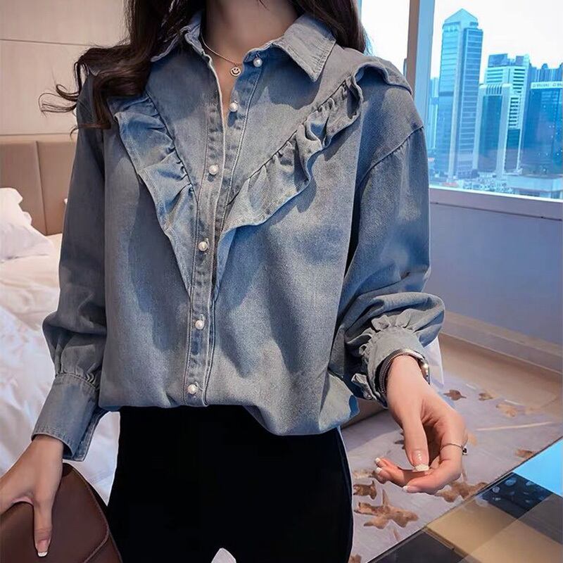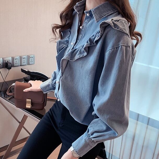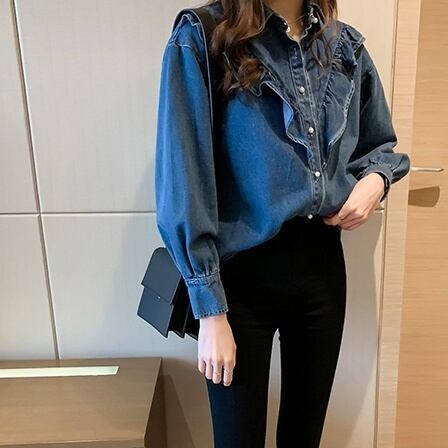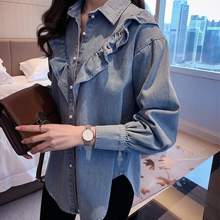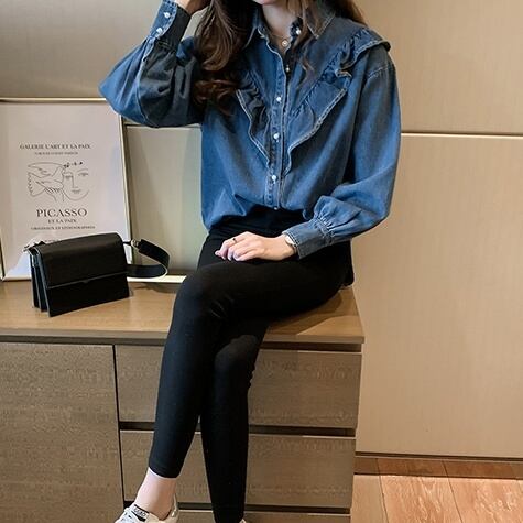 トップス シャツ デニムシャツ ミディアム丈 長袖 角襟 前開き ボタン フリル かわいい 大人可愛い きれいめ シンプル 上品 おしゃれ かっこいい レトロ きちんと こなれ感 個性的 主役級 存在感 抜け感 オールシーズン ナチュラル ベーシック クール メンズライク 無地 レディース 女性用 ママ OL 通勤 オフィス 学生 通学 デート お出かけ お泊まり イベント 女子会 休日 アウトドア カフェ ショッピング レストラン コンパ レイヤード 重ね着 普段使い 着回し M L XL 2XL
