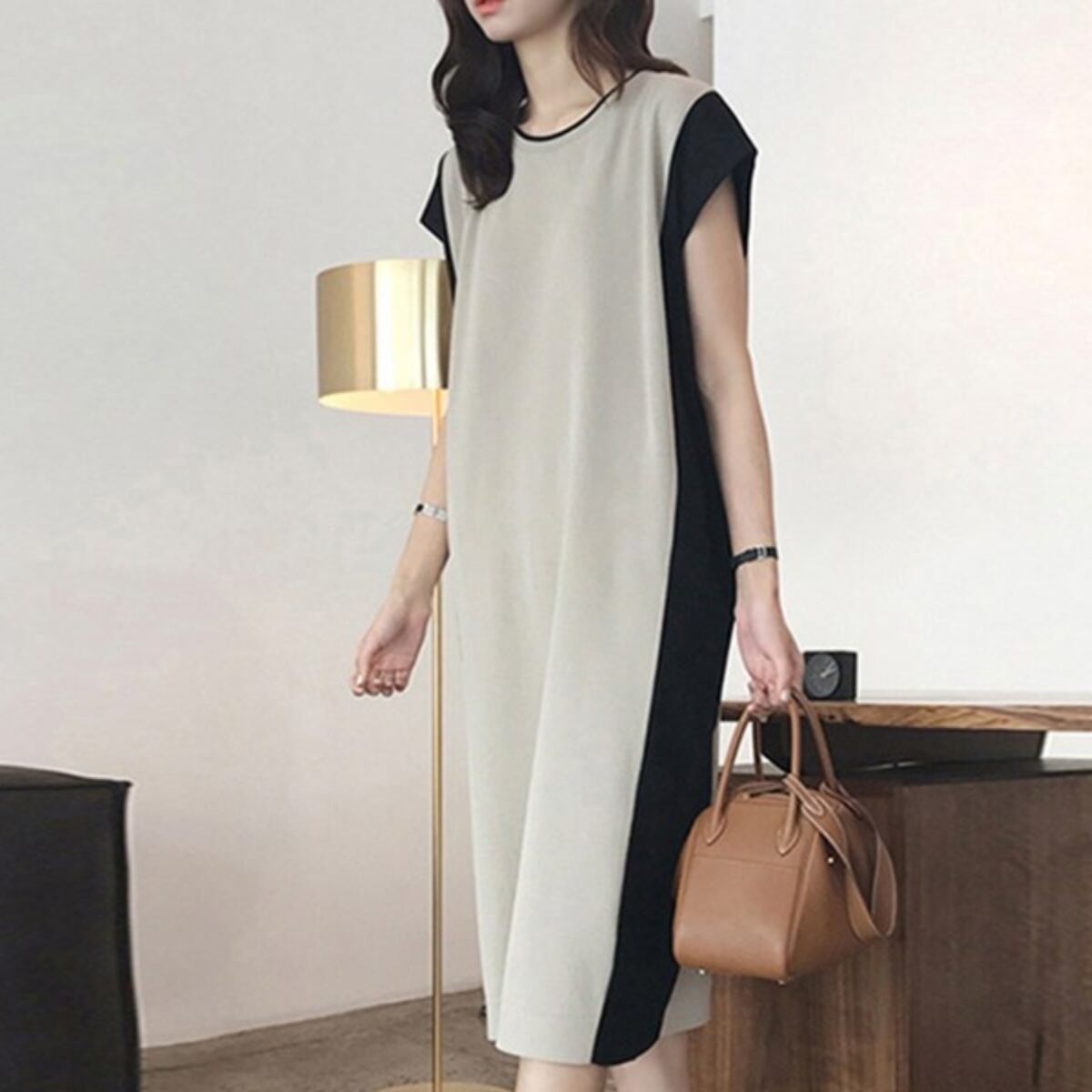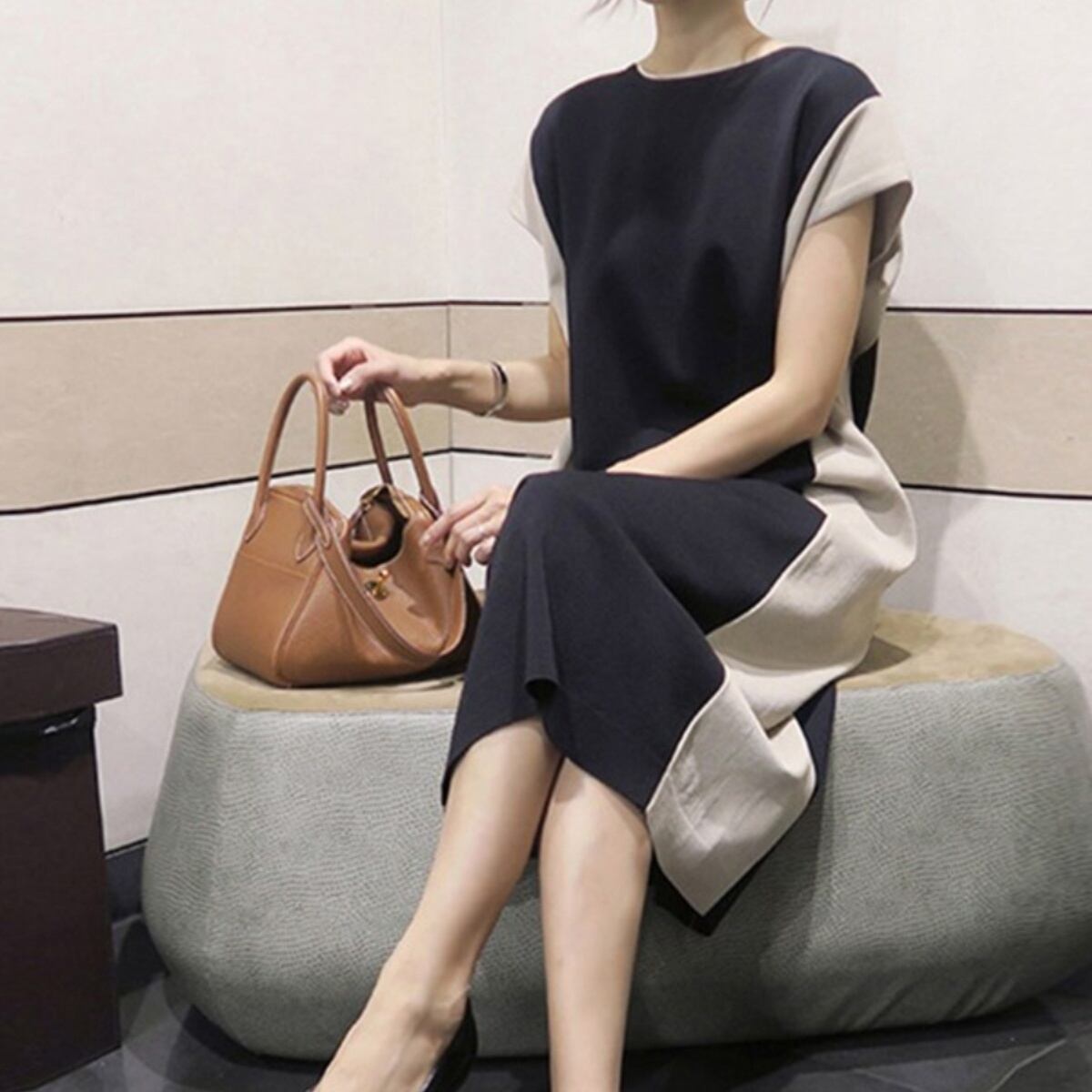 シンプルながらもエレガントで女性らしい印象を与えるミディアム丈ワンピース。