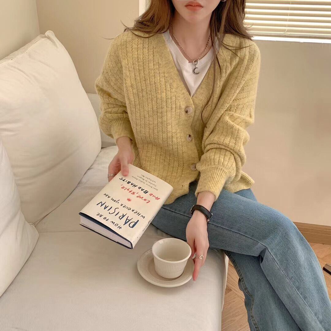 Vネックとボタンが女性らしい印象を与え、どんなスタイルにもマッチします。