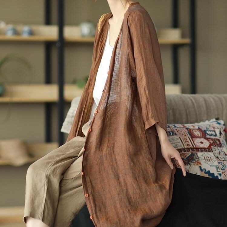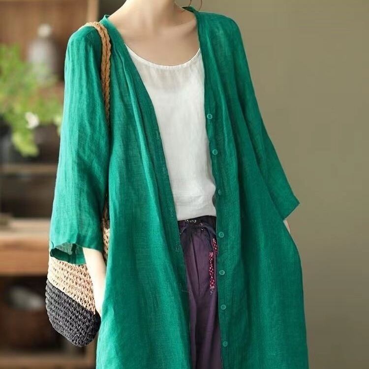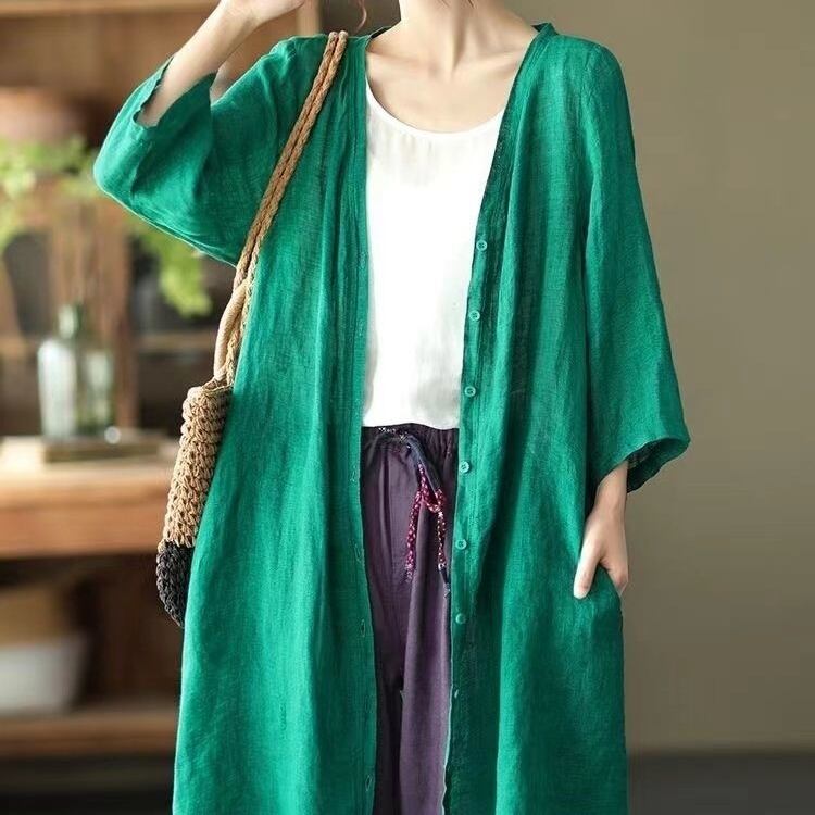 トップス シャツ ロング丈 7分袖 Vネック 前開き ボタン ポケット 薄手 かわいい 大人可愛い きれいめ シンプル 上品 おしゃれ かっこいい レトロ きちんと こなれ感 個性的 主役級 存在感 抜け感 春 夏 ナチュラル ベーシック クール メンズライク 無地 レディース 女性用 ママ OL 通勤 オフィス 学生 通学 デート お出かけ お泊まり イベント 女子会 休日 アウトドア カフェ ショッピング レストラン コンパ レイヤード 重ね着 普段使い 着回し M L XL 2XL 日焼け防止
