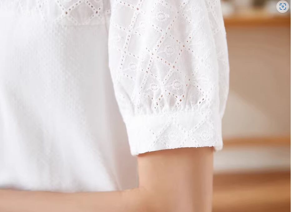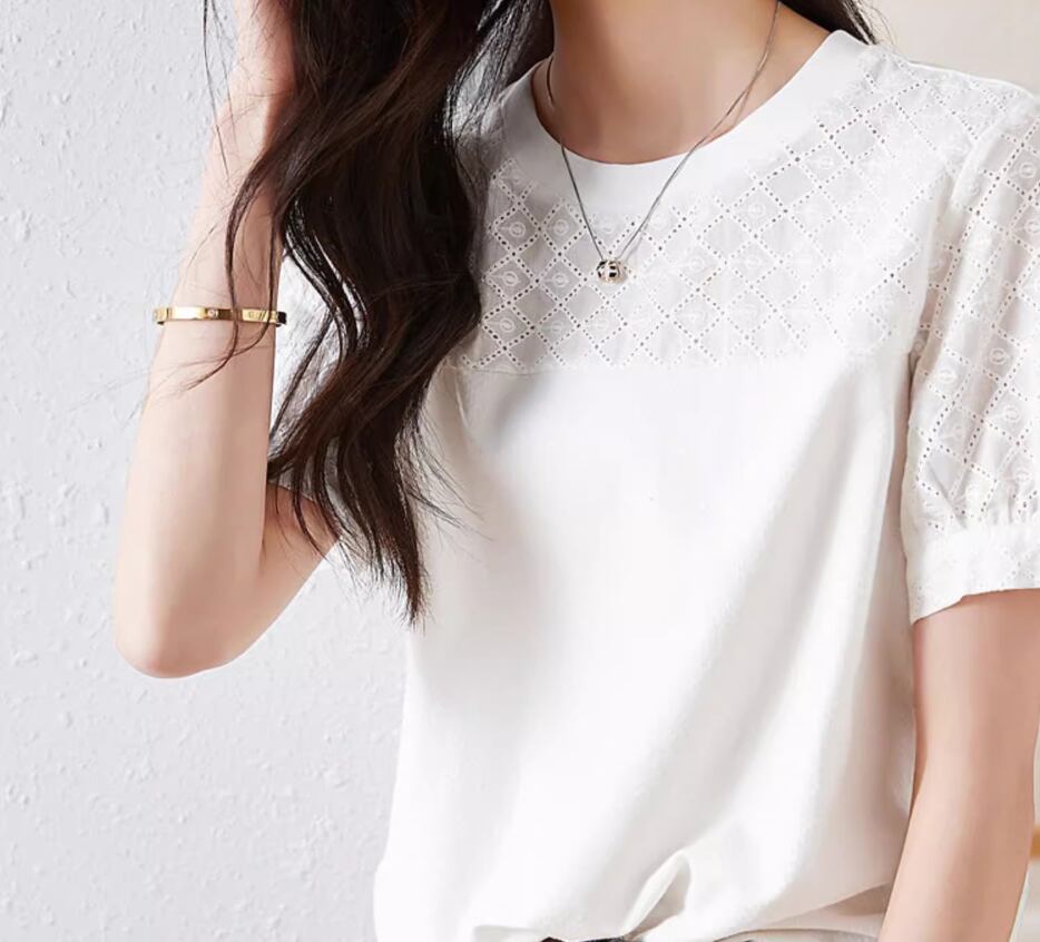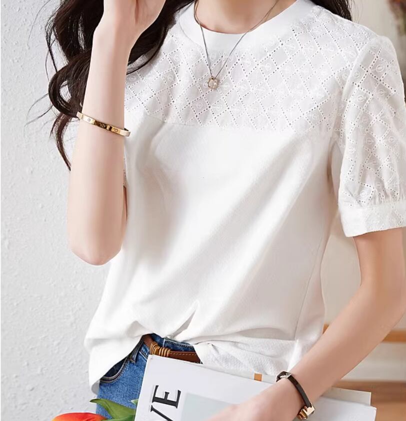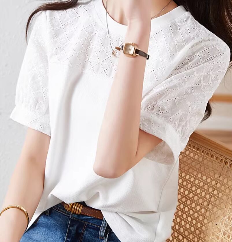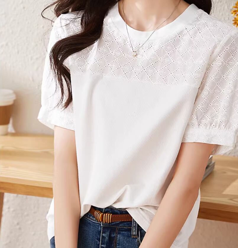トップス Tシャツ 白トップス 袖あり 半袖 パフスリーブ ラウンドネック ストレート 伸縮性 かわいい 大人可愛い シンプル カジュアル おしゃれ お洒落 こなれ感 ガーリー 無地 格子柄 春 夏 10代 20代 30代 40代 レディース 女性用 ママ お出かけ 休日 旅行 着回し 普段使い 楽ちん S M L XL 2XL 白 ホワイト