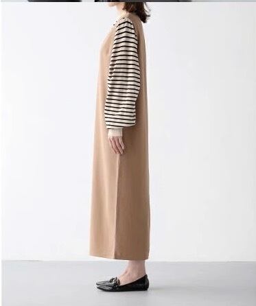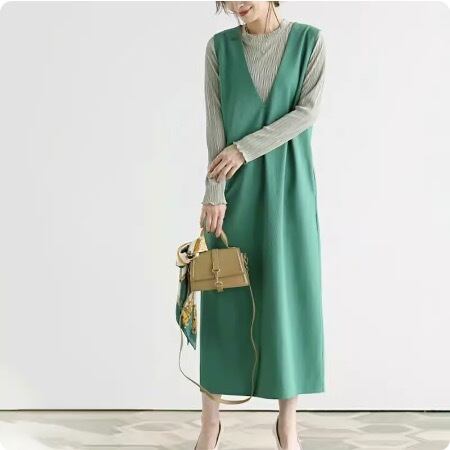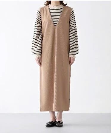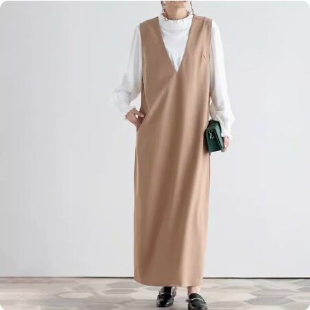 一枚でさまざまなコーディネートが楽しめるシンプルロングワンピース。女性らしいVネックと襟なしのデザインは、大人可愛さと上品さを演出してくれます。ストレートなIラインで体型をカバーしつつ、映える存在感を放ちます。さりげないポケットも嬉しいポイントです。
