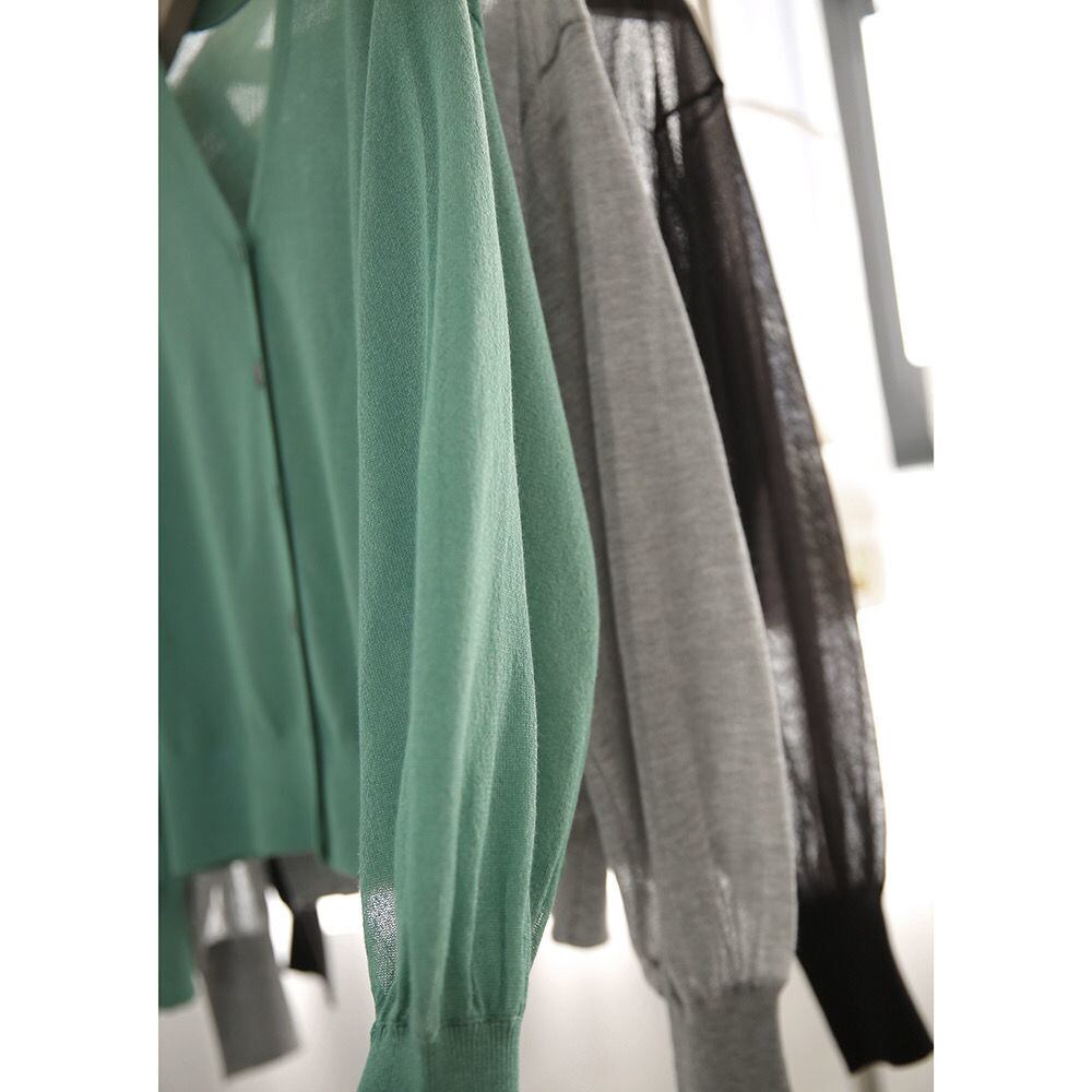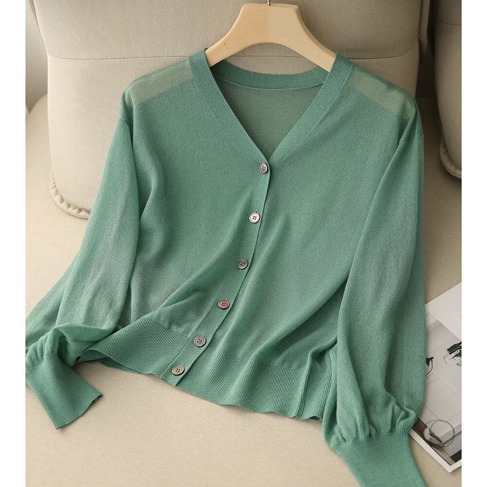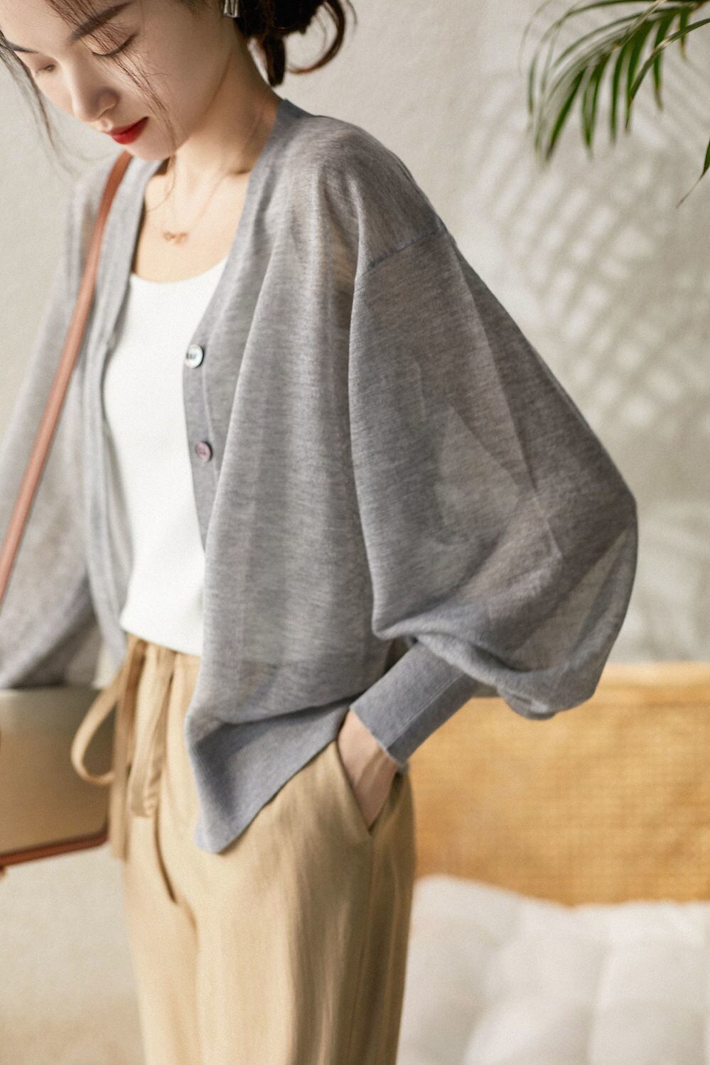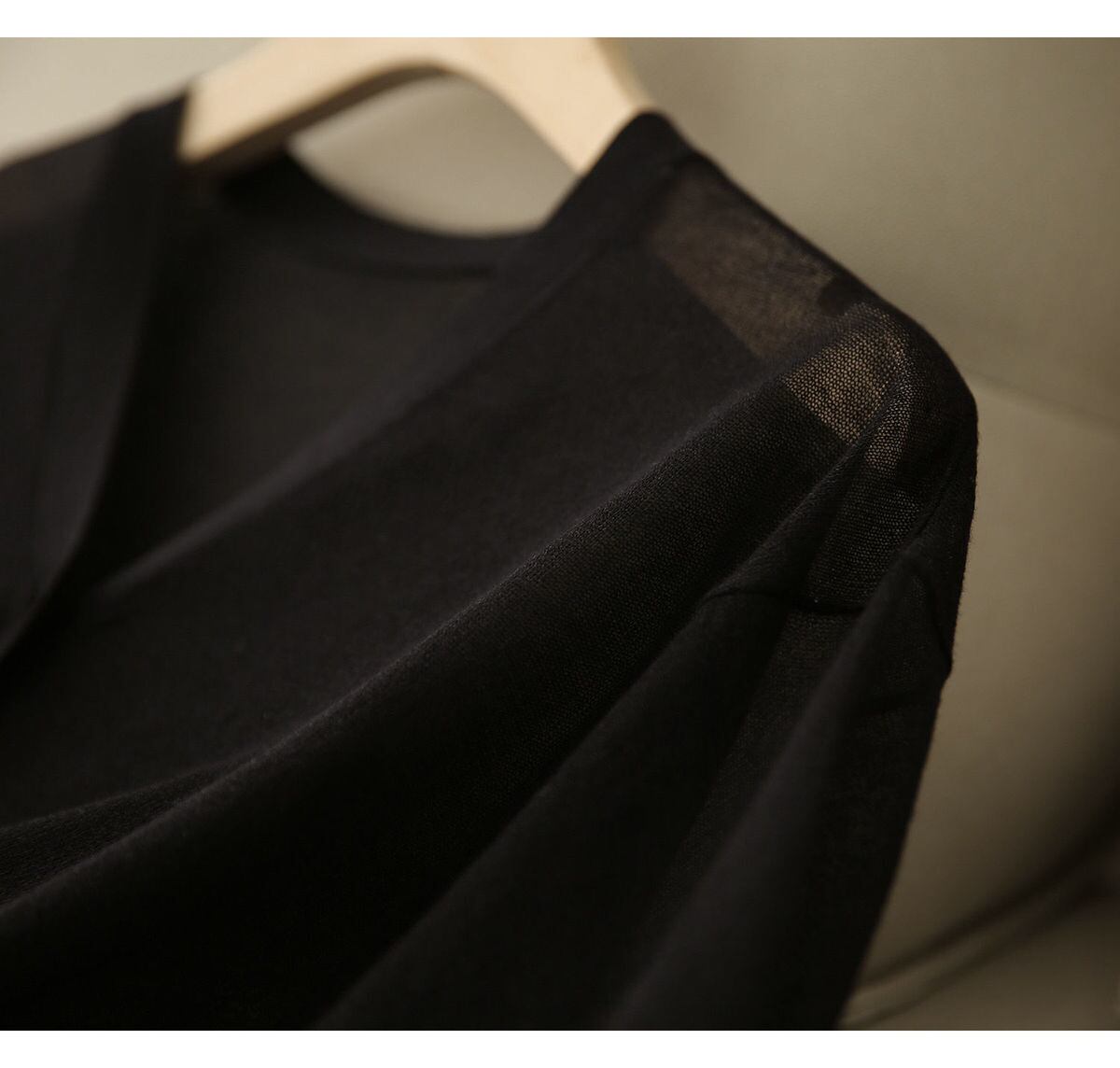 この薄手のカーディガンは、大人女子にぴったりのおしゃれアイテムです。ミディアム丈で袖あり、フレアスリーブが女性らしさを引き立てます。Vネックで前開きなので、着脱もラクチン。透け感のある素材が涼やかな印象を与えます。