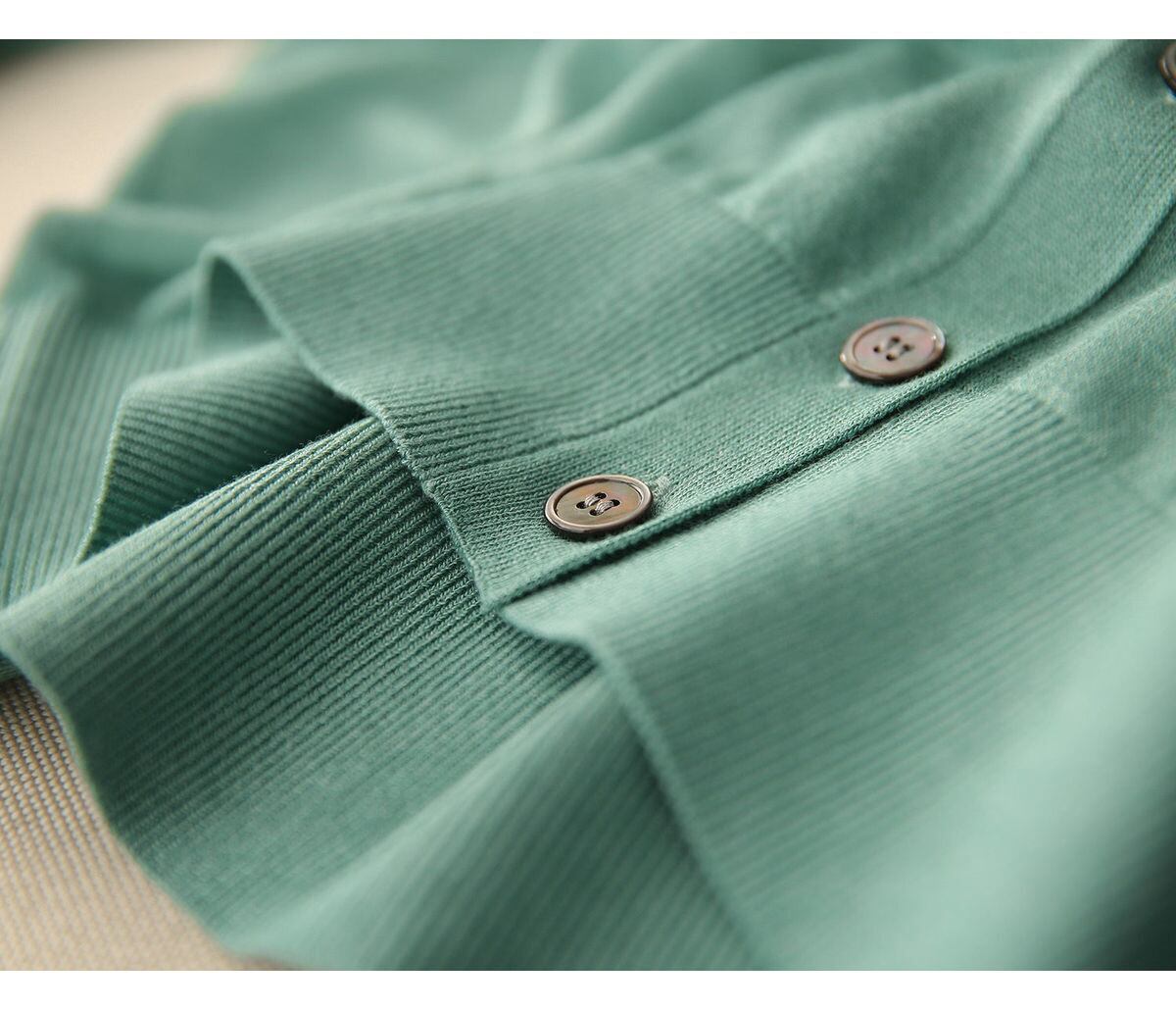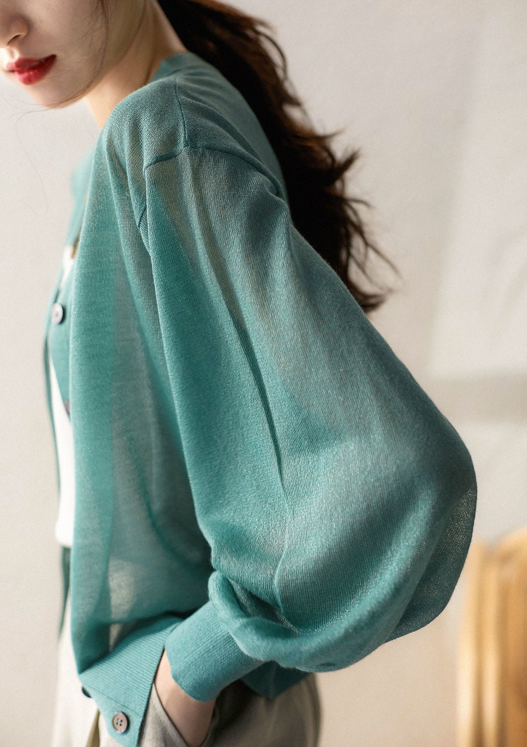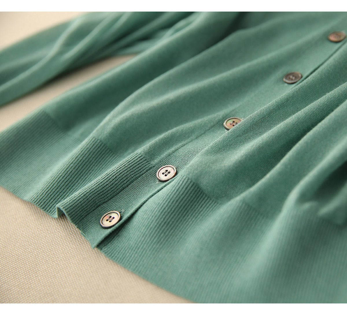 この薄手のカーディガンは、大人女子にぴったりのおしゃれアイテムです。ミディアム丈で袖あり、フレアスリーブが女性らしさを引き立てます。Vネックで前開きなので、着脱もラクチン。透け感のある素材が涼やかな印象を与えます。