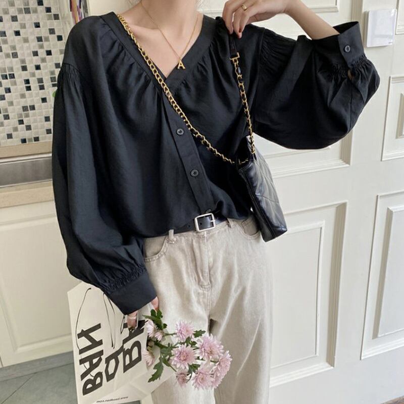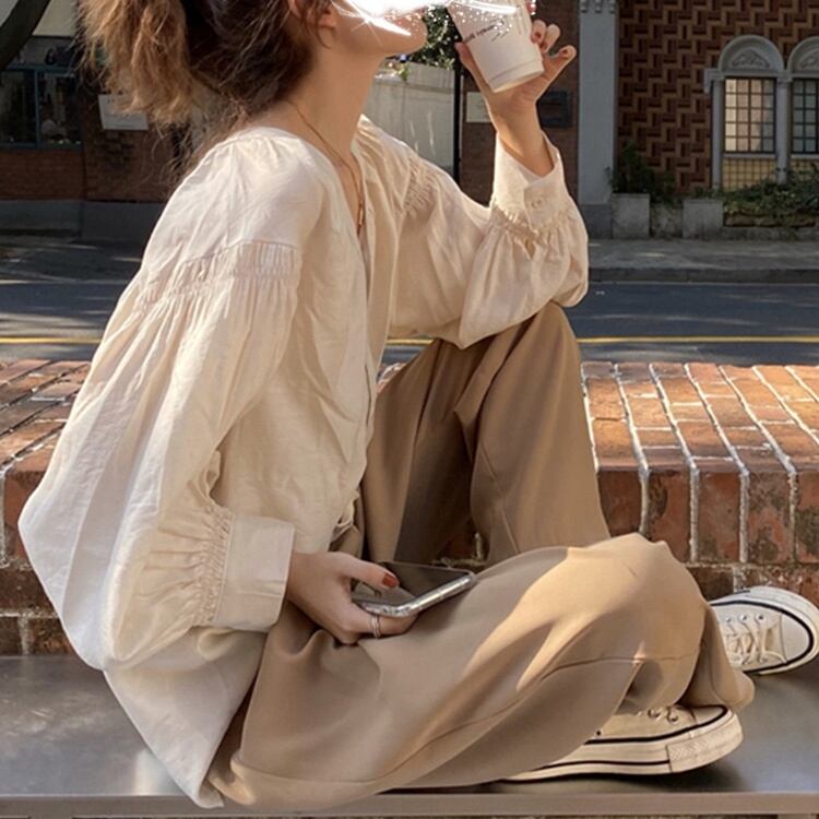 トップス シャツ ブラウス ミディアム丈 プルオーバー 長袖 ボリューム袖 Vネック かわいい 大人可愛い きれいめ シンプル 上品 おしゃれ かっこいい レトロ きちんと こなれ感 個性的 主役級 存在感 抜け感 ナチュラル ベーシック キュート ガーリー メンズライク 無地 レディース 女性用 ママ OL 通勤 オフィス 学生 通学 デート お出かけ お泊まり イベント 女子会 休日 アウトドア カフェ ショッピング レストラン コンパ レイヤード 重ね着 普段使い 着回し S M L XL