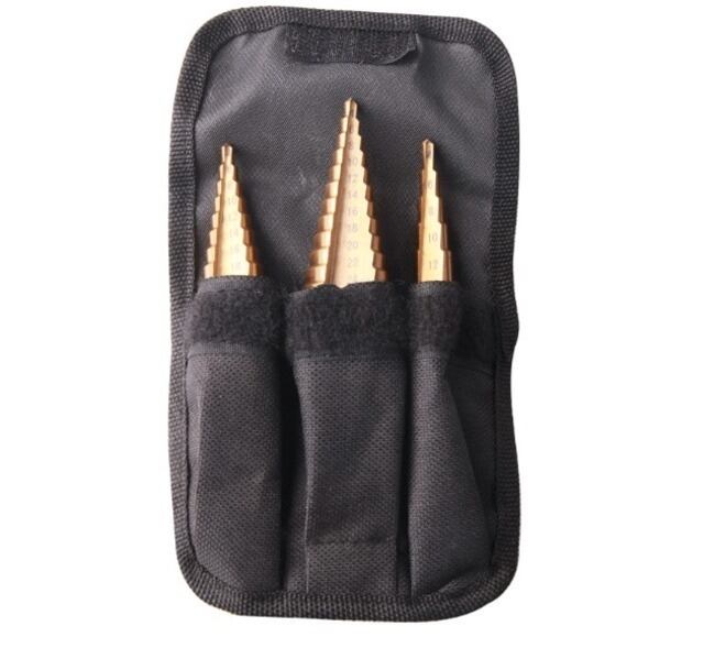 HSS鋼タイプのステップドリル3本セットです。作業がはかどる収納ポーチ付き!