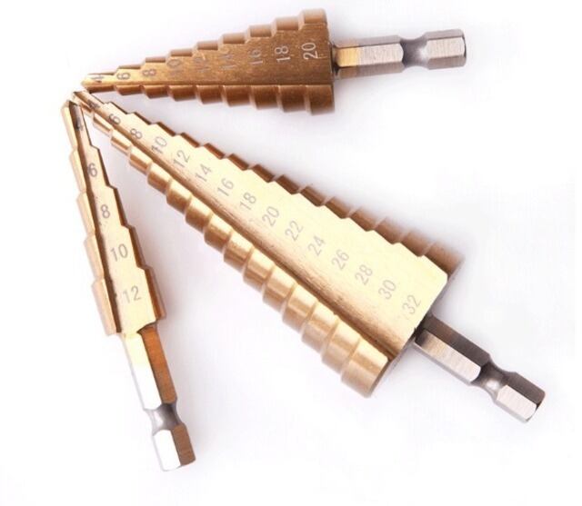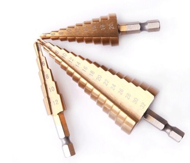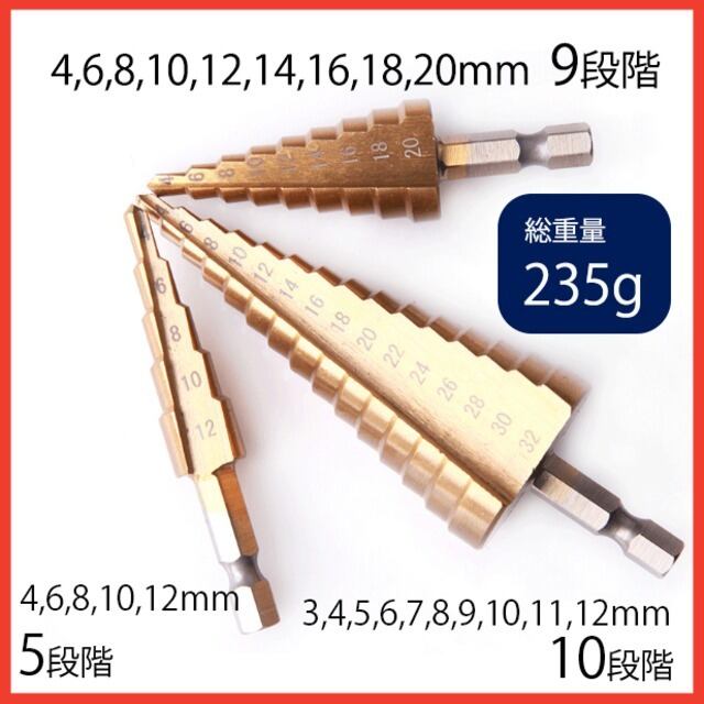 ステップドリル タケノコドリル チタンコーティング 六角軸 HSS鋼 穴あけチタン 収納袋付 3本セット(4-20 4-12 4-32ミリ)