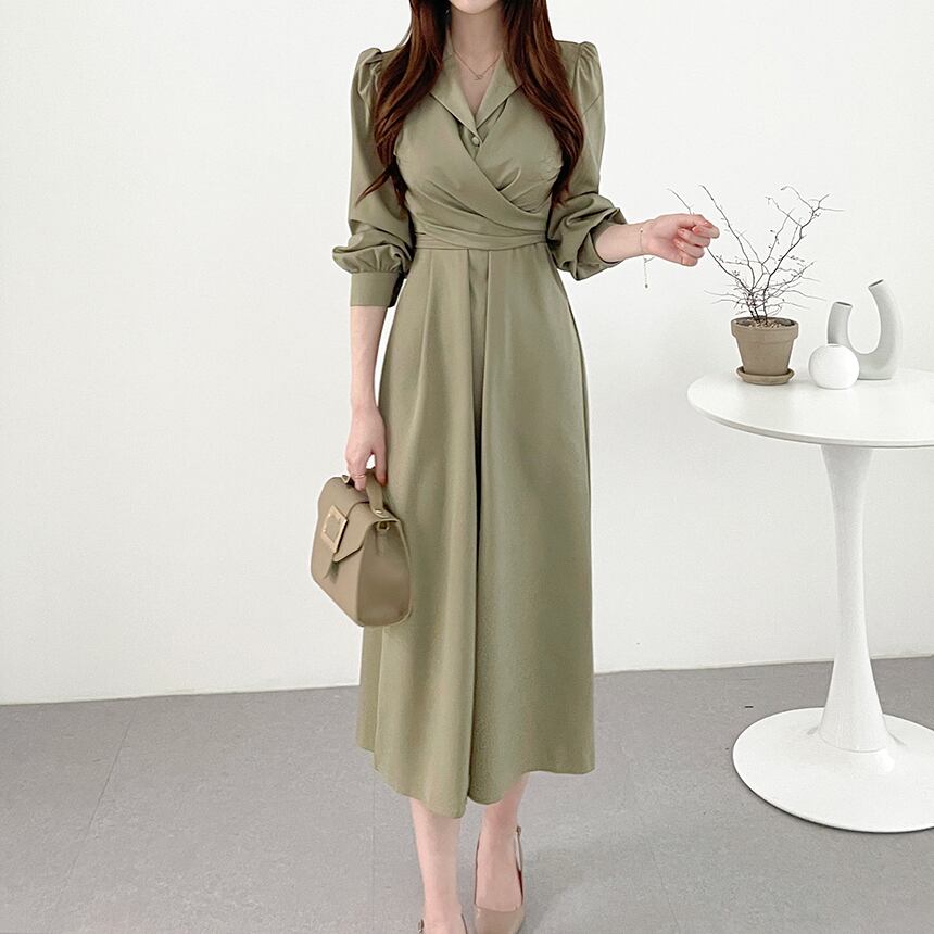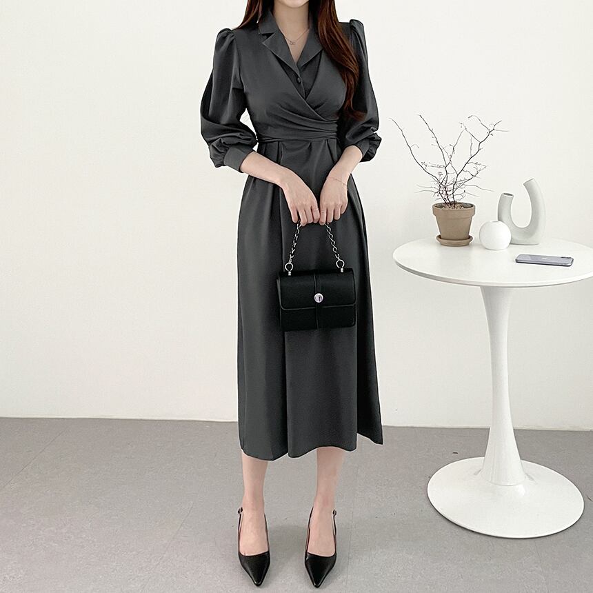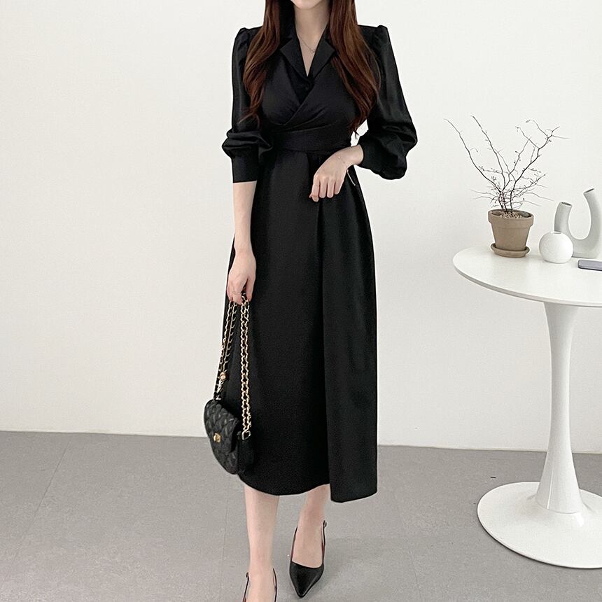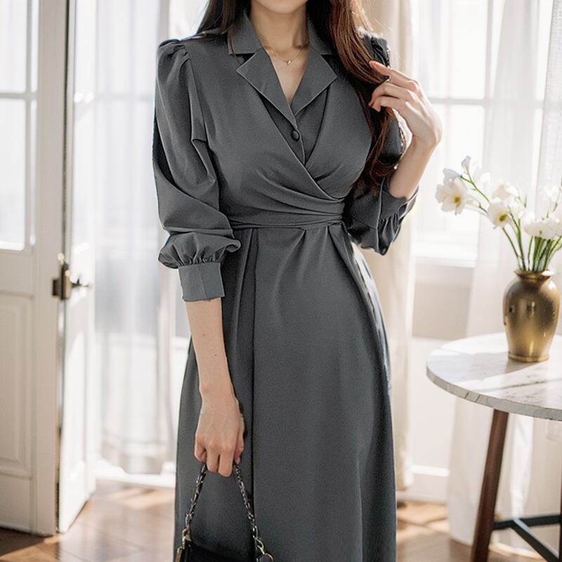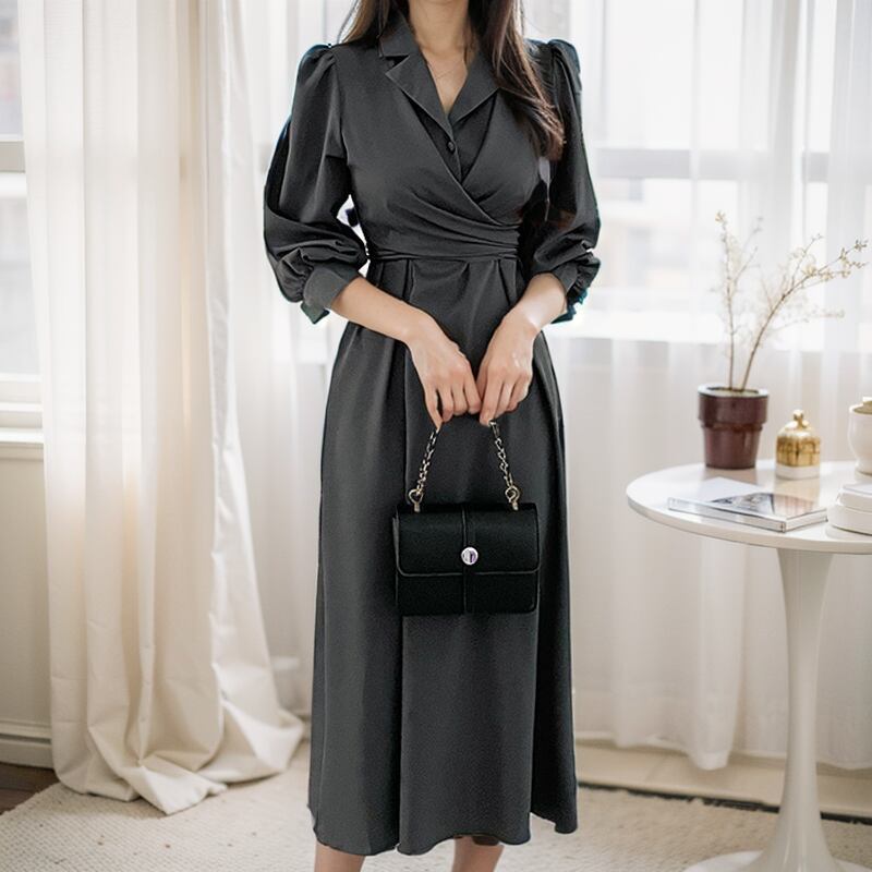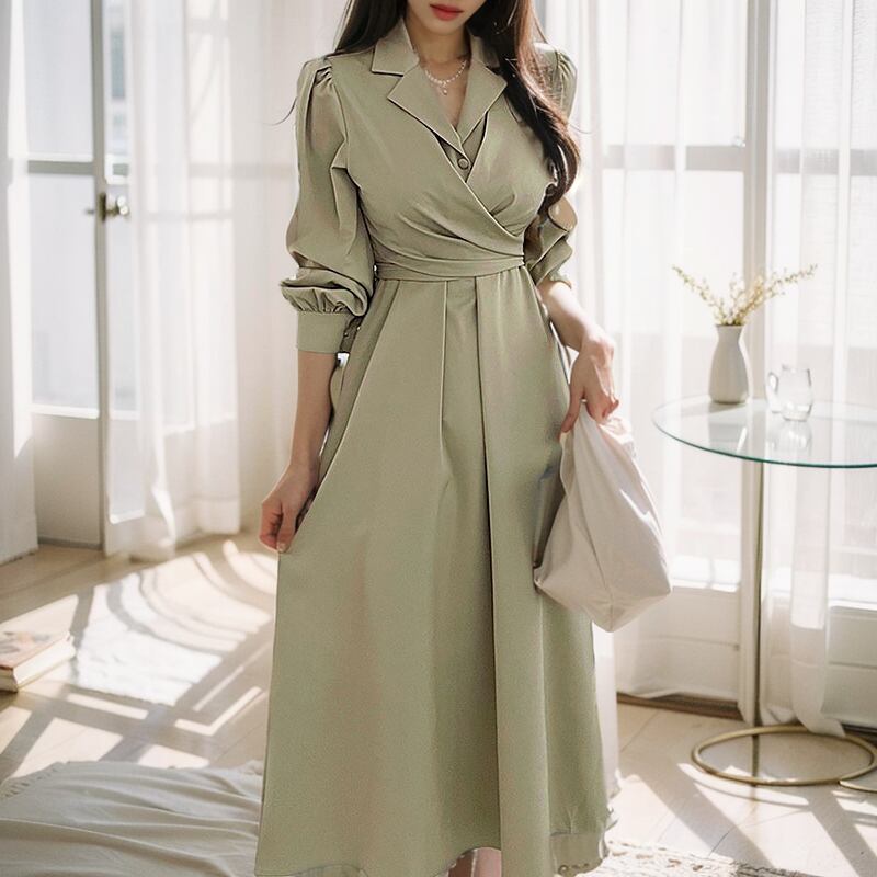 レディース ワンピース ドレス シャツワンピ ロング 長袖 パフスリーブ スーツ襟 Aライン ハイウエスト かわいい 大人可愛い きれいめ シンプル カジュアル 上品 おしゃれ かっこいい ガーリー エレガント 無地 秋 デート お出かけ パーティー イベント レストラン 女子会 ホテル ガーデン 韓国 コーデ 体型カバー 脚長 普段使い 着回し モテ トレンド 流行 インスタ映え フリーサイズ ブラック グレー グリーン