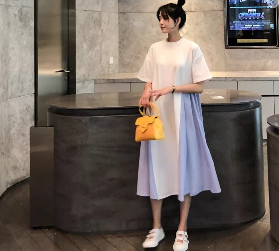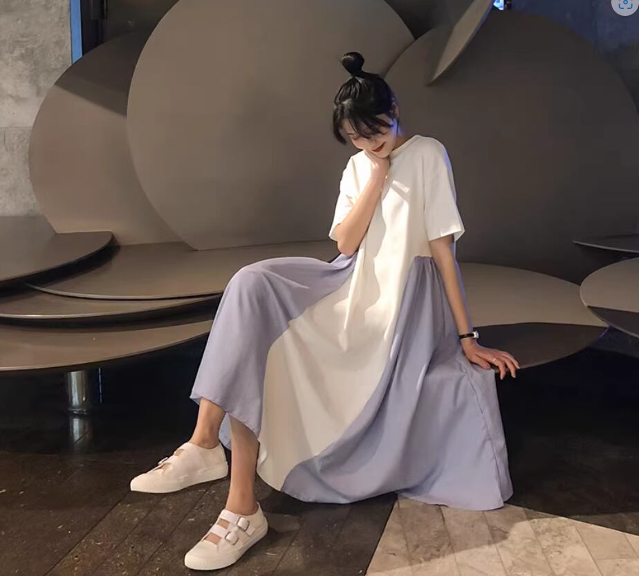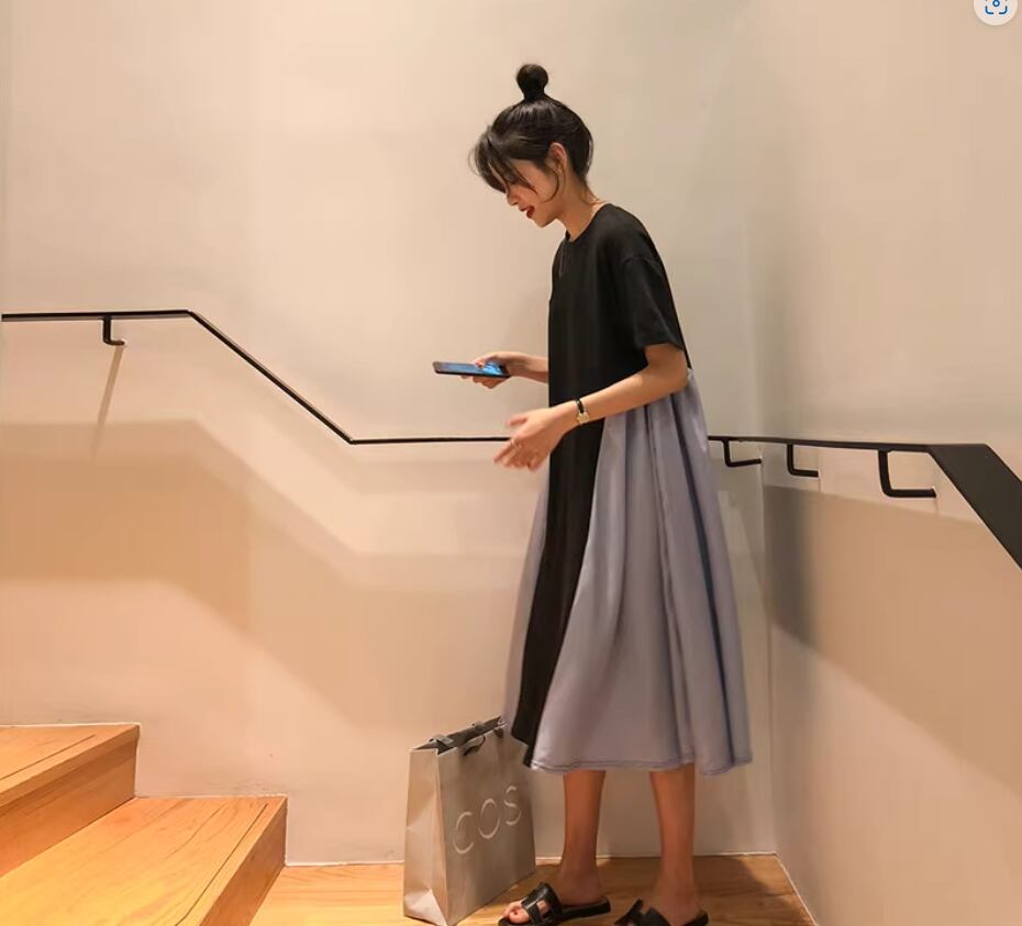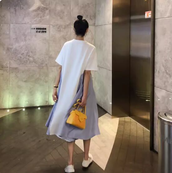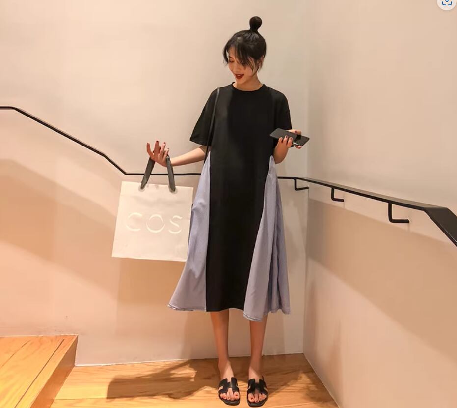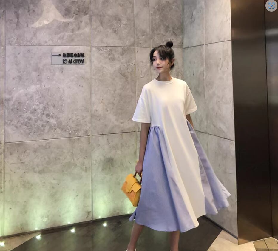 ワンピース ミディアム丈 袖あり 半袖 ラウンドネック Aライン 切り替えデザイン 綿 かわいい 大人可愛い カジュアル おしゃれ お洒落 こなれ感 存在感 無地 夏 10代 20代 30代 40代 レディース 女性用 ママ マタニティ お出かけ 休日 着回し 普段使い 重ね着 楽ちん 体型カバー M L XL 2XL 白 ホワイト 黒 ブラック バイカラー