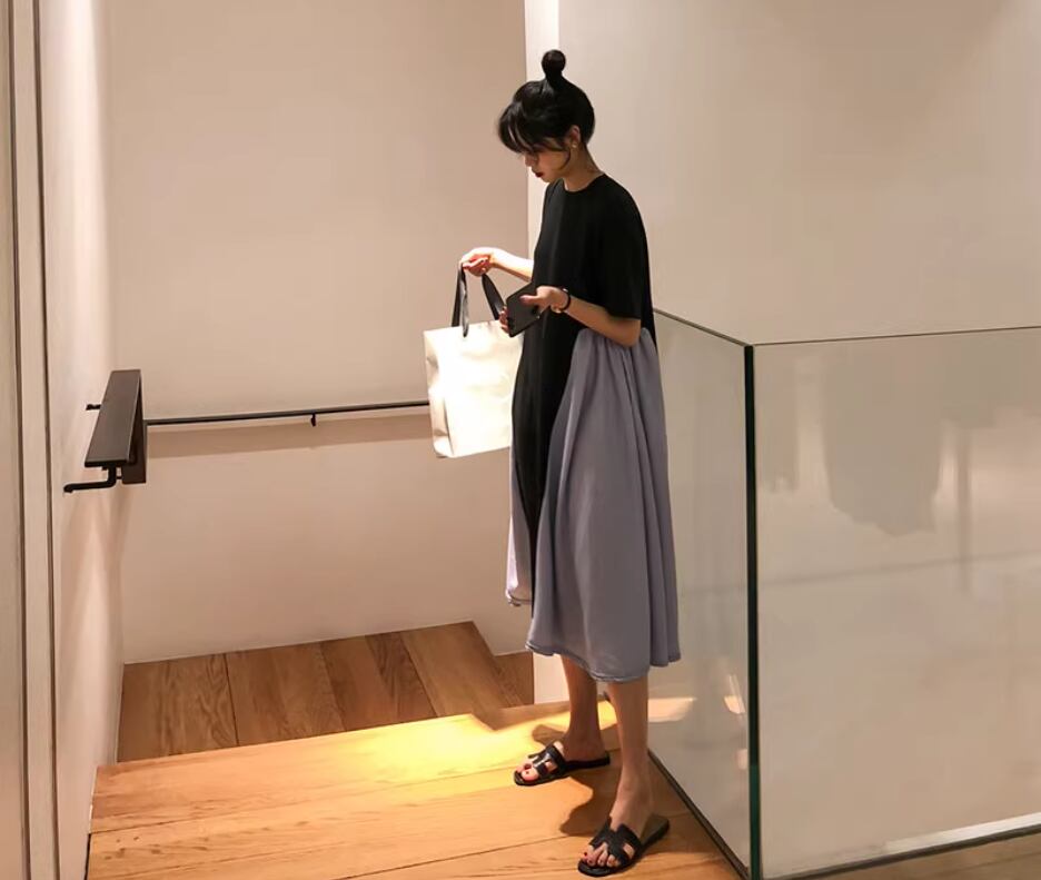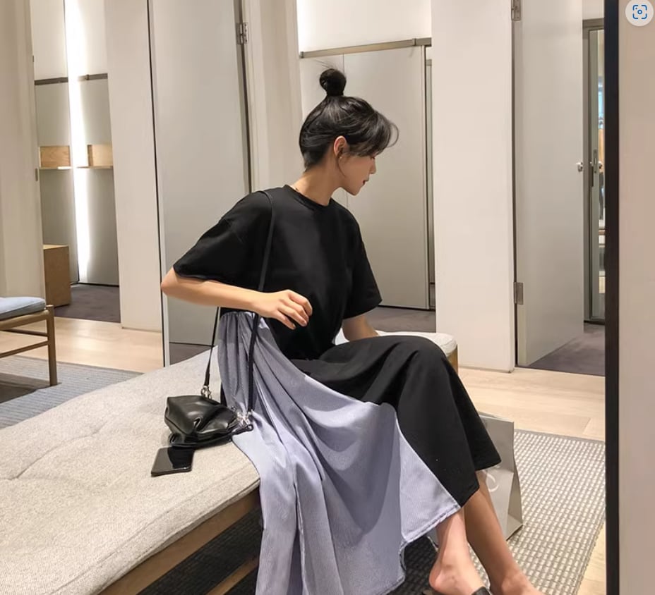 バイカラーデザインが目をひくミディアム丈ワンピース