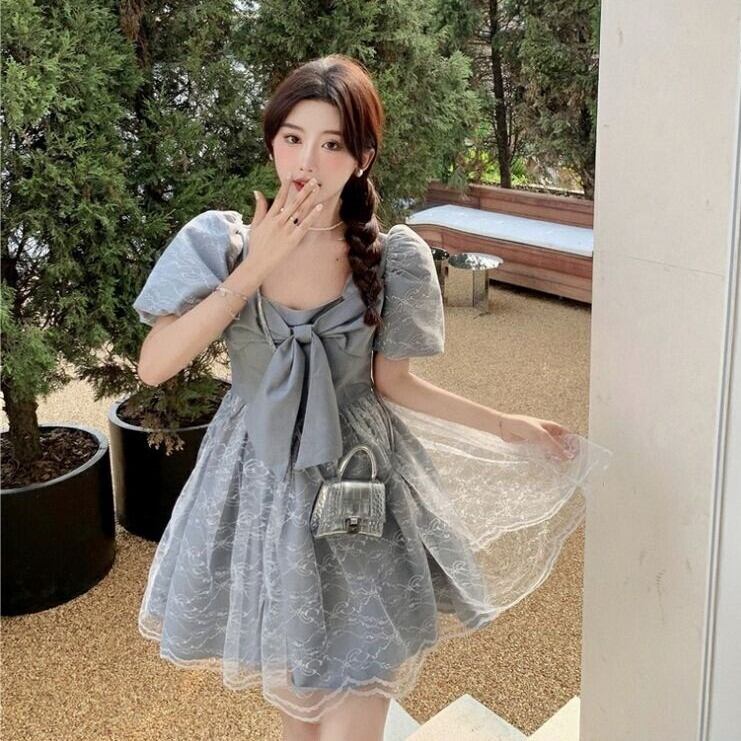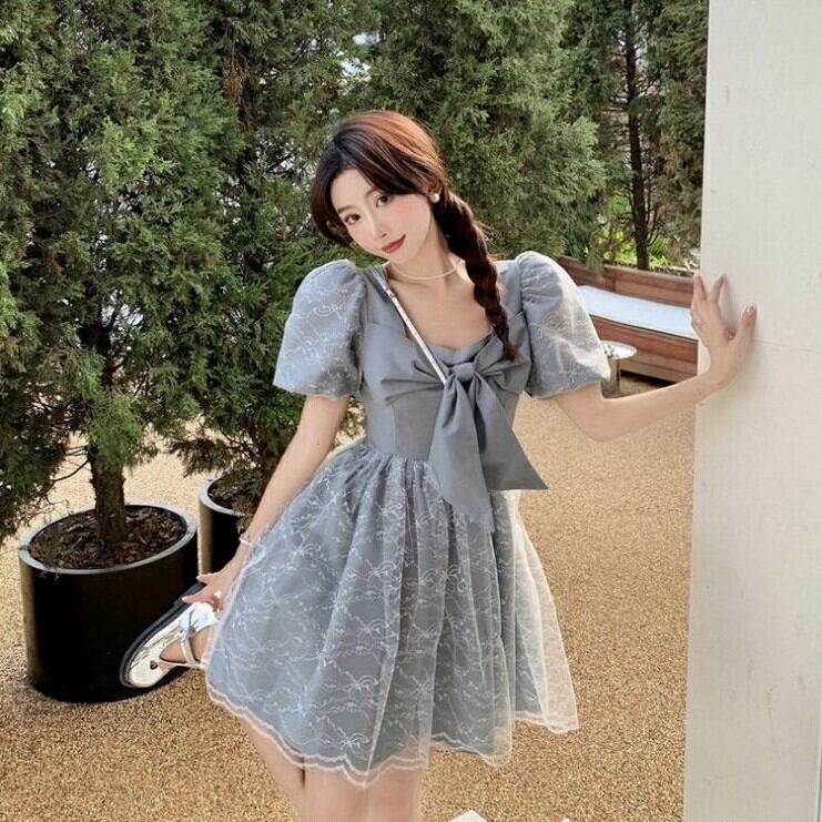 ドレス ウェディング パーティー 結婚式 二次会 披露宴 謝恩会 ショート 半袖 パフスリーブ Vネック プリンセスライン レース シフォン リボン ハイウエスト 可愛い きれいめ カジュアル おしゃれ キュート ガーリー 華やか フェミニン 無地 韓国 脚長 光沢感 春 夏 S M L ホワイト グレー