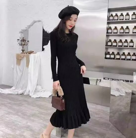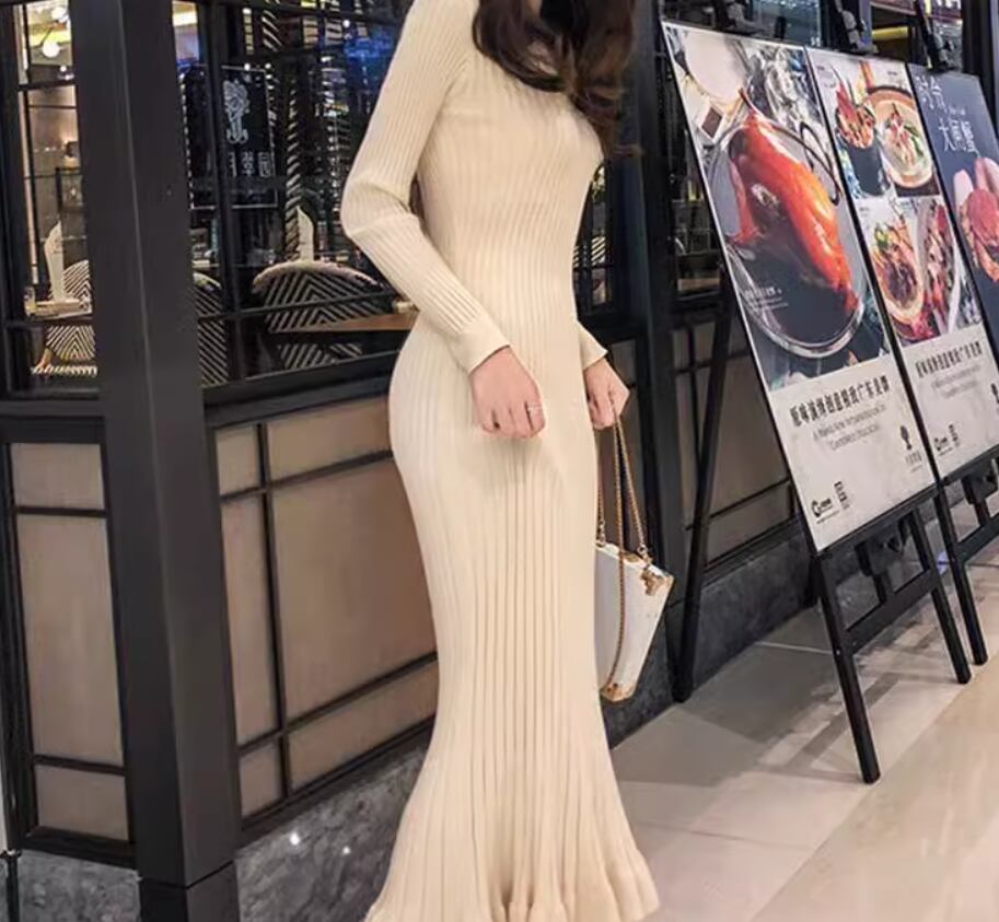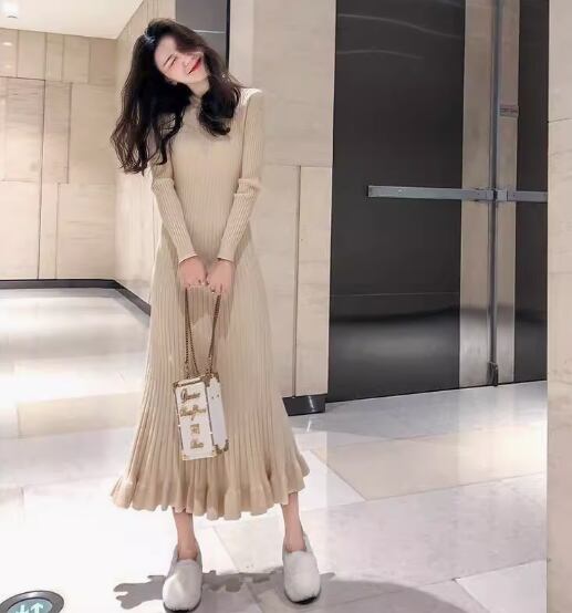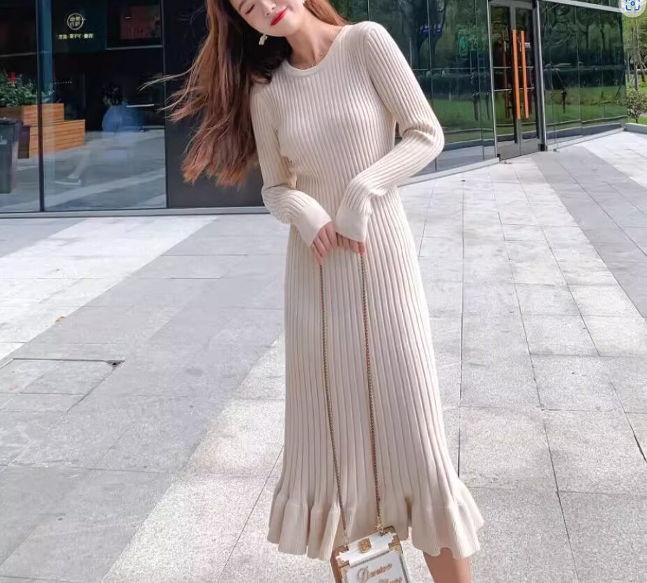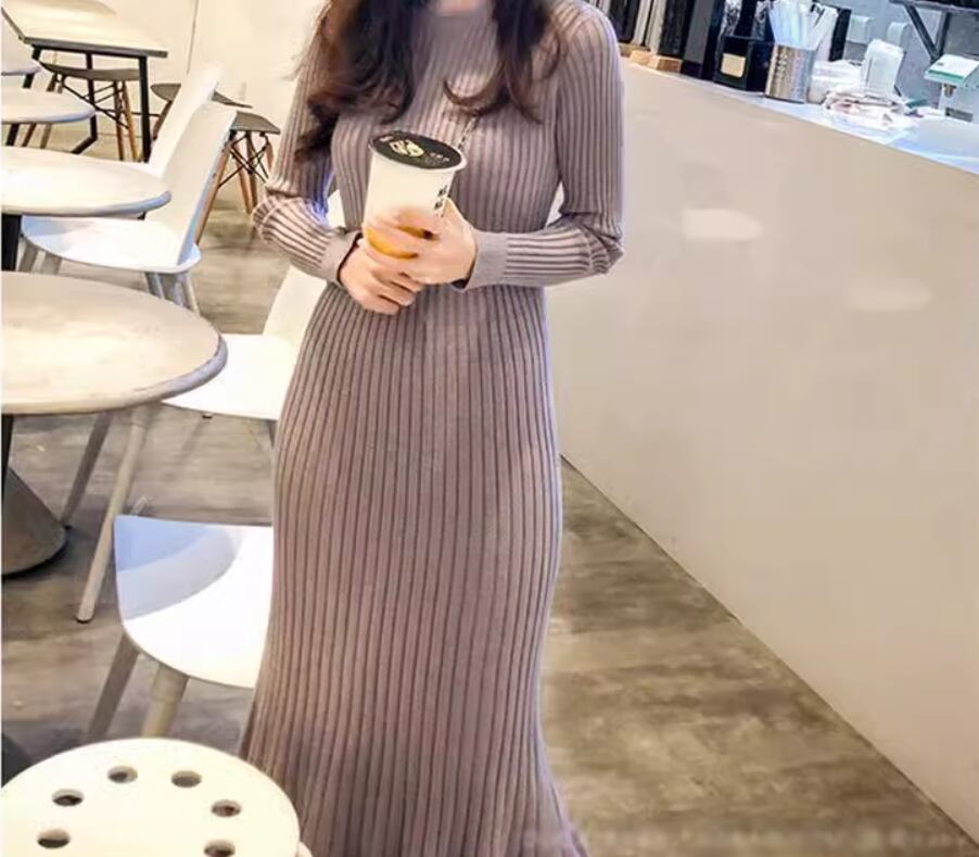 ワンピース ニットワンピース ミディアム丈 袖あり 長袖 ラウンドネック Aライン リブニット 伸縮性 ニット きれいめ シンプル 大人 上品 おしゃれ お洒落 こなれ感 エレガント 無地 秋 冬 20代 30代 40代 レディース 女性用 ママ お出かけ 休日 着回し 普段使い 楽ちん S M L XL 黒 ブラック 青 ブルー アプリコット スモークパープル バーガンディ