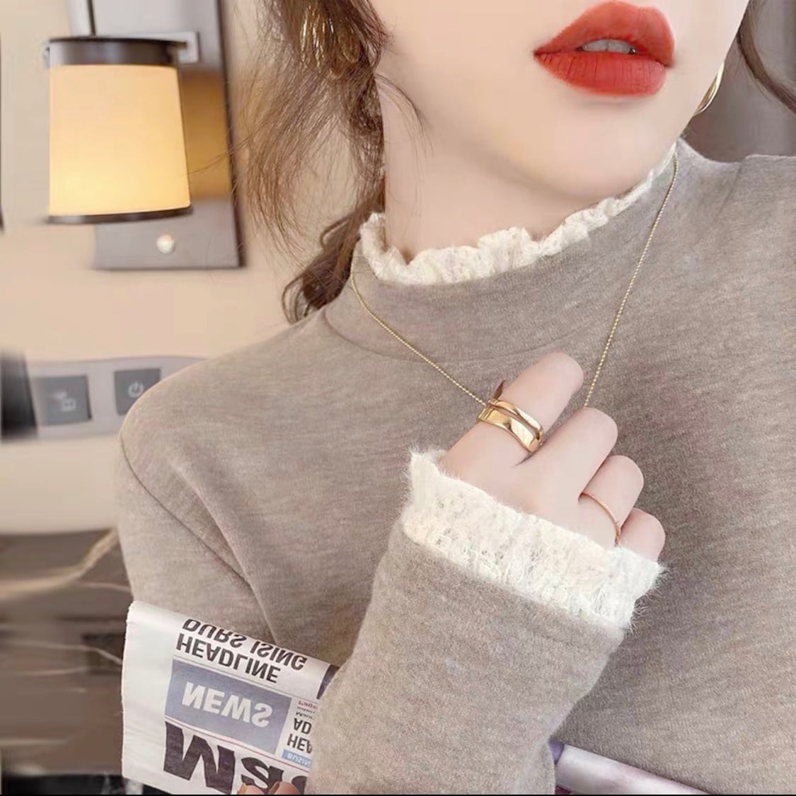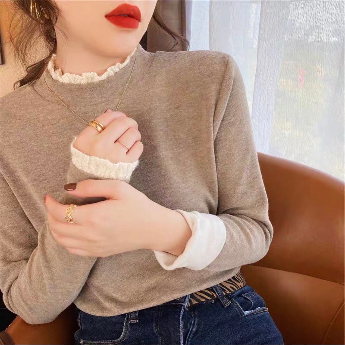 存在感抜群のレースのフリルが、女性らしさと上品さを引き立てる一枚です。