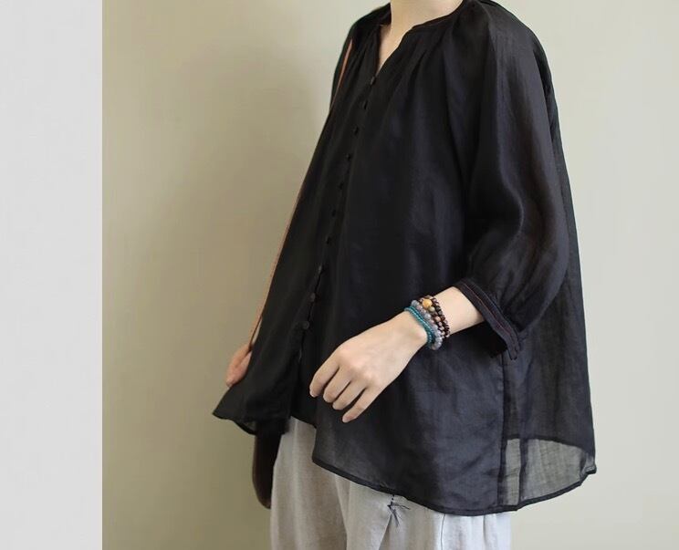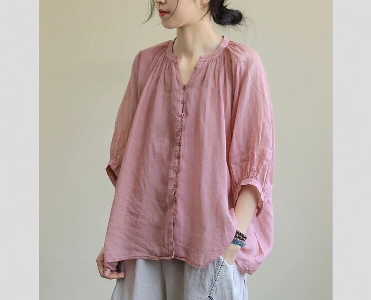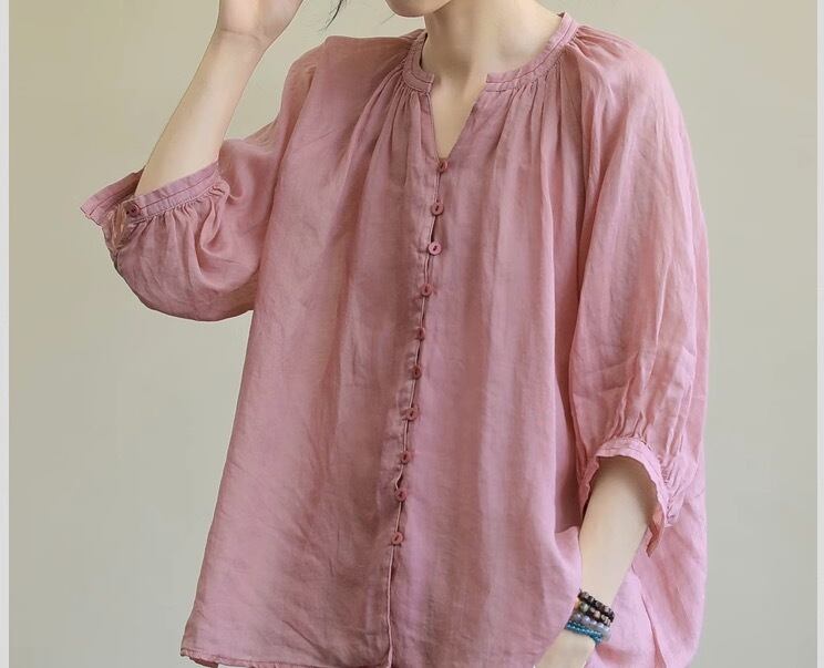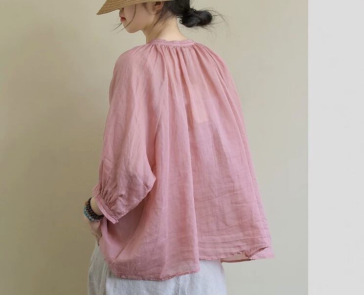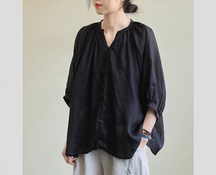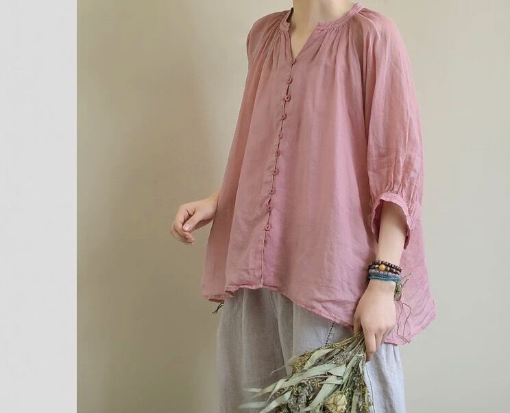 ミディアム丈で袖ありのカットソー。Vネックで襟なし、前開きのデザインがポイント。袖部分にボリュームがあるので、トップス1枚でコーディネートの主役になれる優れもの。薄手なので、春夏にぴったり。カジュアルからきれいめまで、幅広いスタイリングに対応します。