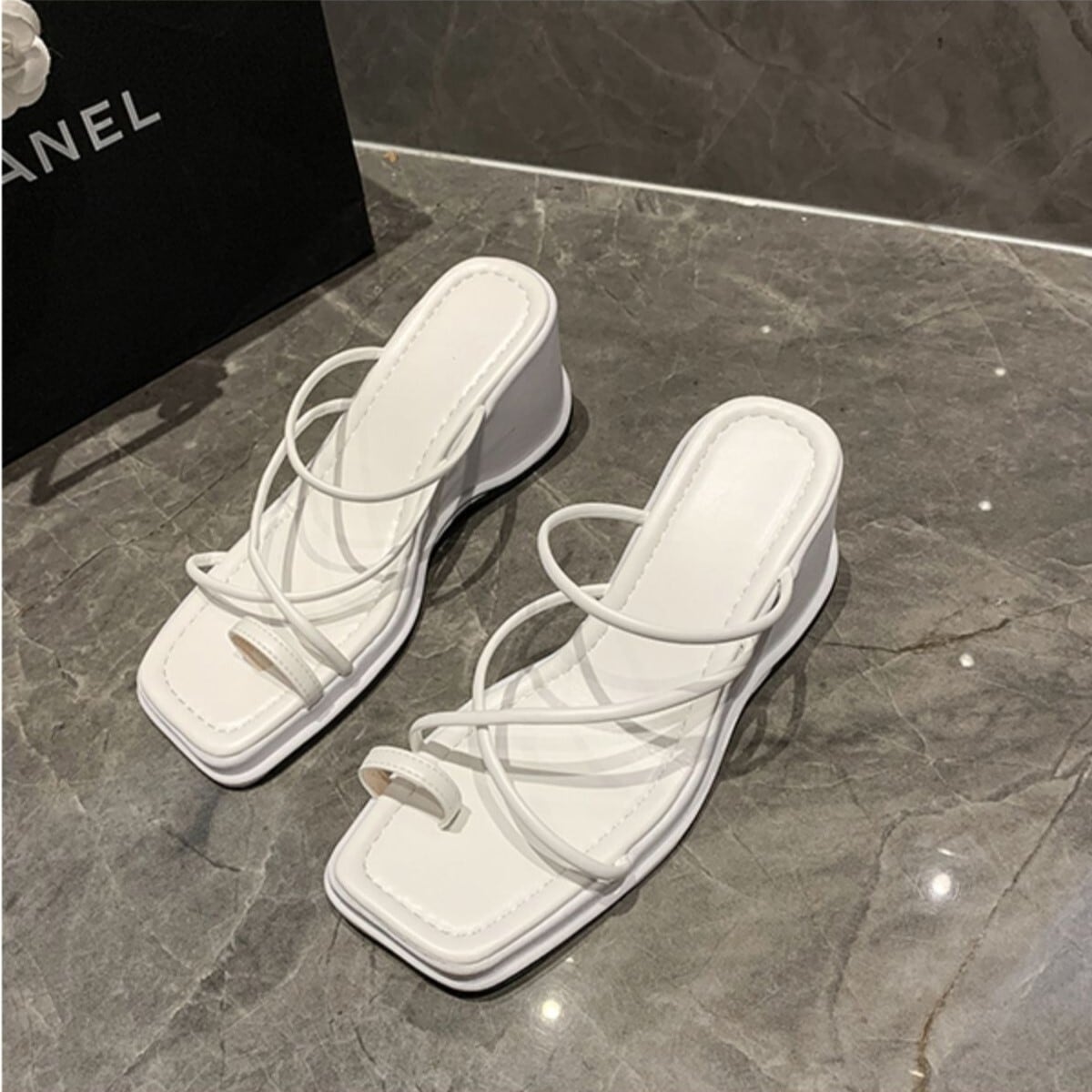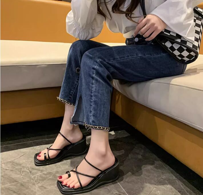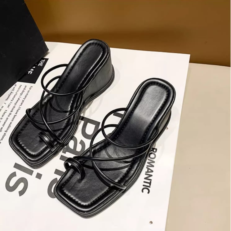 スクエアトゥがトレンド感ある、ウェッジソールのサンダル。